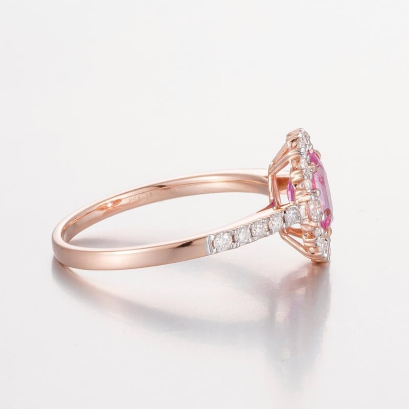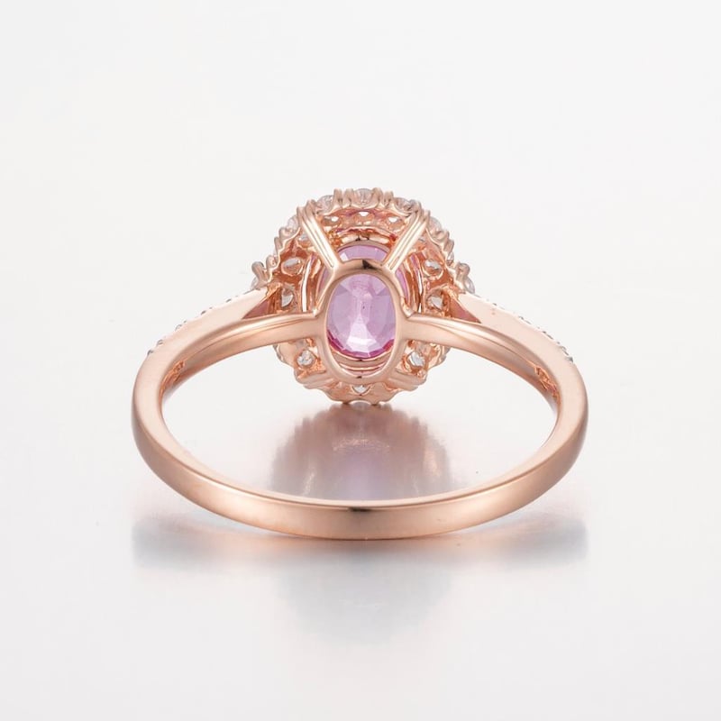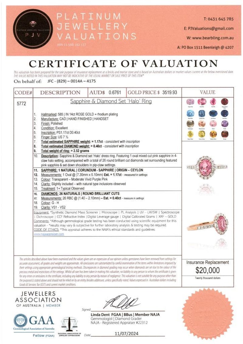 14CT ROSE GOLD PINK CEYLON SAPPHIRE AND DIAMOND DRESS RING. Featuring Centre, One Oval Cut, Moderate Vivid Purple Pink Ceylon Sapphire (1.17Ct Slightly Included), Claw Set, With 26 Round Brilliant Cut Diamonds (0.40Ct Tdw, G-H Colour, Vs1-Vs2 Clarity), Bead Set. Ring Size O. Valuations Provided by an Independent Third-Party Professional Not Directly Associated With Lloyds Auctions at AUD $20000This valuation has been conducted by an independent third-party professional. The valuation amount is an assessment by the issuing valuer and does not reflect the auction value of the item. Any inquiries regarding the valuation should be directed to the issuing valuer (refer to contact details on the certificate), as Lloyds Auctions has no affiliation or influence over the valuation, the valuer, or the stated amount. Condition: Good - Refer Images 0586156+455