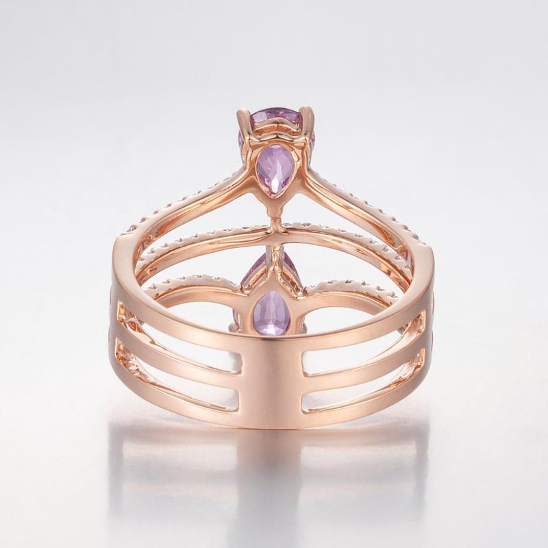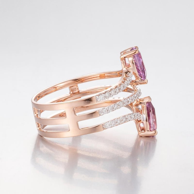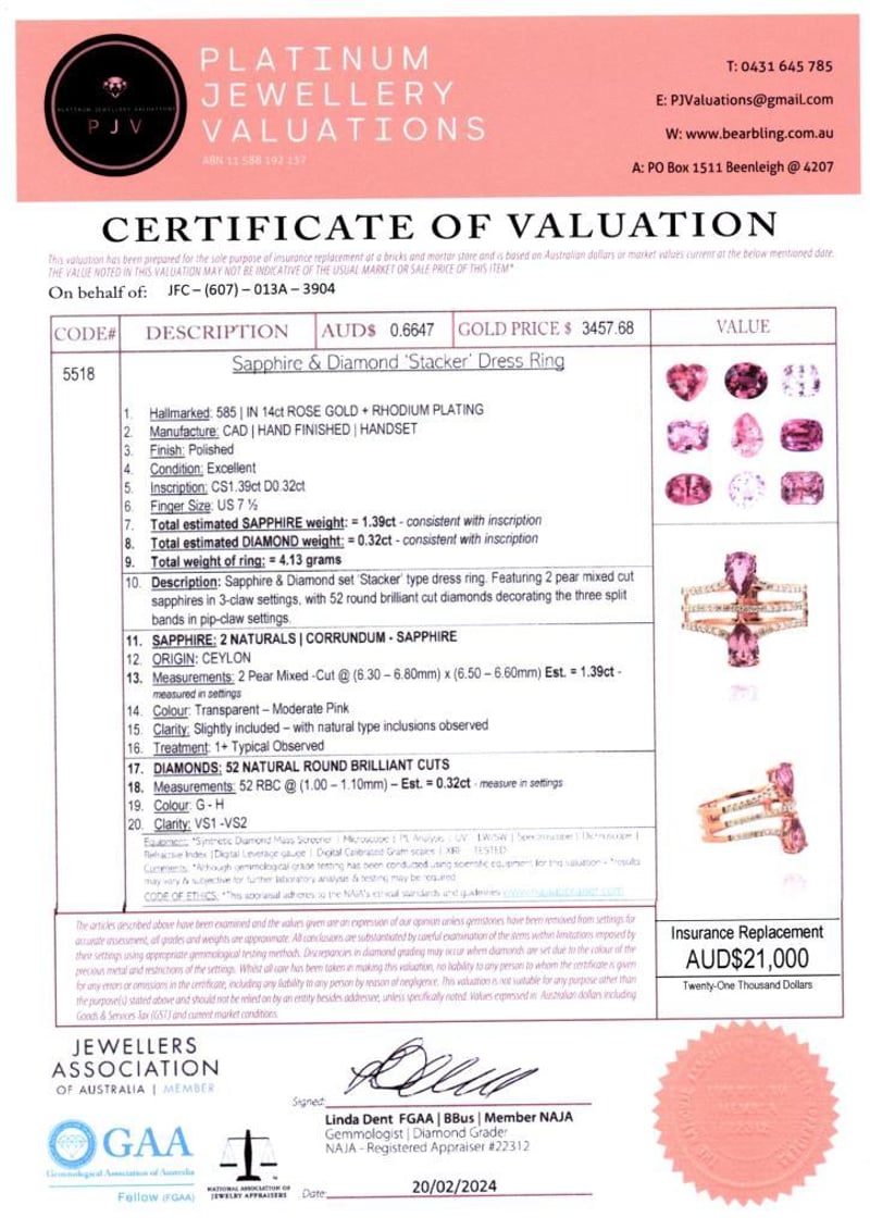 14CT ROSE GOLD PINK SAPPHIRE AND DIAMOND STACKER STYLE RING . Featuring Centre, 2 Pear Cut, Modeate Pink Sapphires (1.39Ct Slightly Included), Claw Set, With 52 Round Brilliant Cut Diamonds (0.32Ct Tdw, G-H Colour, Vs1-Vs2 Clarity), Pip Claw Set. Ring Size O. Valuations Provided by an Independent Third-Party Professional Not Directly Associated With Lloyds Auctions at AUD $21000This valuation has been conducted by an independent third-party professional. The valuation amount is an assessment by the issuing valuer and does not reflect the auction value of the item. Any inquiries regarding the valuation should be directed to the issuing valuer (refer to contact details on the certificate), as Lloyds Auctions has no affiliation or influence over the valuation, the valuer, or the stated amount. Condition: Good - Refer Images 0586156+456