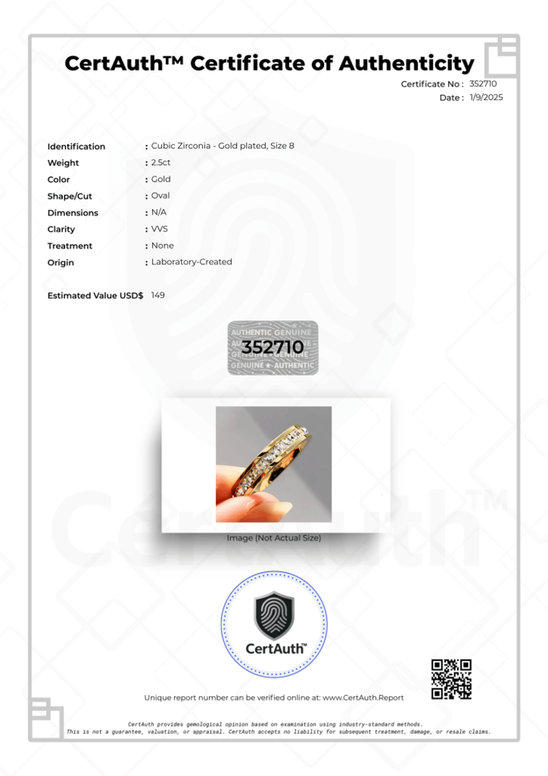 2.5CT CUBIC ZIRCONIA RING – OVAL CUT, GOLD PLATED, SIZE 8, CERTAUTH™ 352710