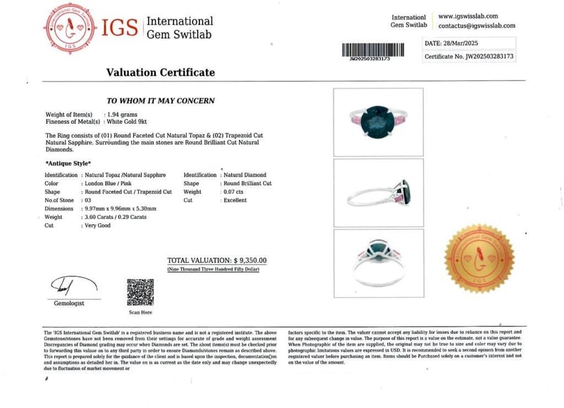 9CT WHITE GOLD LONDON BLUE TOPAZ, PINK SAPPHIRE AND DIAMOND RING Ring White Gold 9K Natural London Blue Topaz : 3.60 Ct. Natural Pink Sapphire : 0.29 Ct. Natural Diamond : 0.07 Carat Item Weight : 1.94 G Valuations Provided by an Independent Third-Party Professional Not Directly Associated With Lloyds Auctions at AUD $9350This valuation has been conducted by an independent third-party professional. The valuation amount is an assessment by the issuing valuer and does not reflect the auction value of the item. Any inquiries regarding the valuation should be directed to the issuing valuer (refer to contact details on the certificate), as Lloyds Auctions has no affiliation or influence over the valuation, the valuer, or the stated amount. Condition: Good - Refer Images 0586170+283173