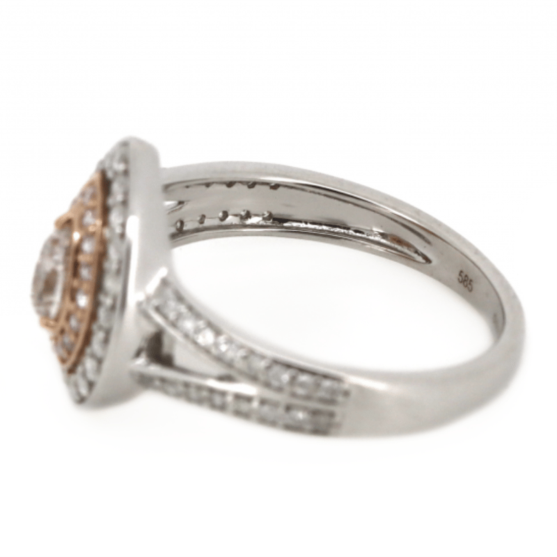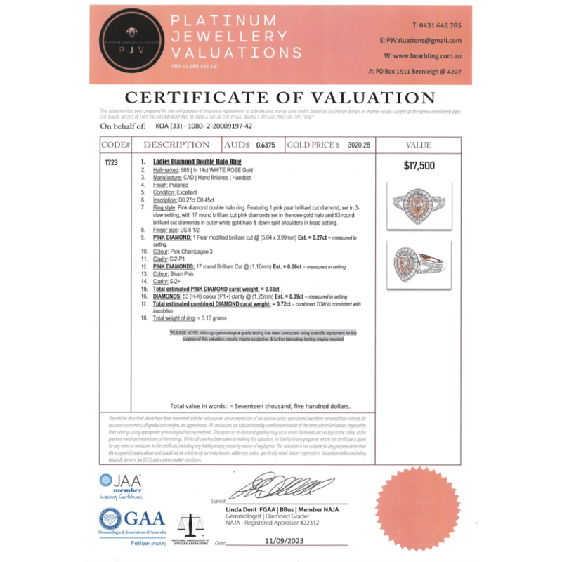 14K WHITE/ROSE GOLD, PINK DIAMOND AND DIAMOND, DOUBLE HALO RING. The Centre Features, One Pear Modified Brilliant Cut, Pink Champagne, Diamond (0.27Ct, Si2-P1 Clarity), Claw Set In Rose Gold. Surrounding The Centre In Halo Are, 17 Round Brilliant Cut, Blush Pink, Diamonds (0.06Ct Tdw, Si2+ Clarity), Bead Set In Rose Gold. Encompassing The Design Are, 53 Round Brilliant Cut, Diamonds (0.39Ct Tdw, H-K Colour, P1+ Clarity), Bead Set In White Gold. Ring Size M. Valuations Provided by an Independent Third-Party Professional Not Directly Associated With Lloyds Auctions at AUD $$17,500.00This valuation has been conducted by an independent third-party professional. The valuation amount is an assessment by the issuing valuer and does not reflect the auction value of the item. Any inquiries regarding the valuation should be directed to the issuing valuer (refer to contact details on the certificate), as Lloyds Auctions has no affiliation or influence over the valuation, the valuer, or the stated amount. Condition: Good - Refer Images 0645845+1560