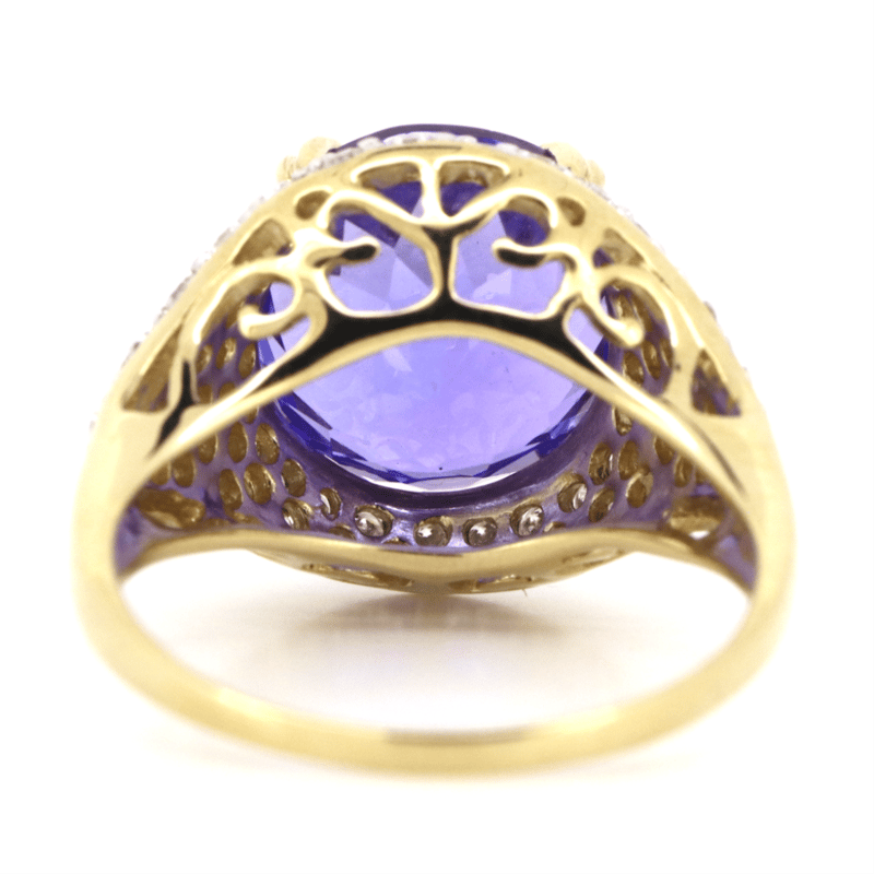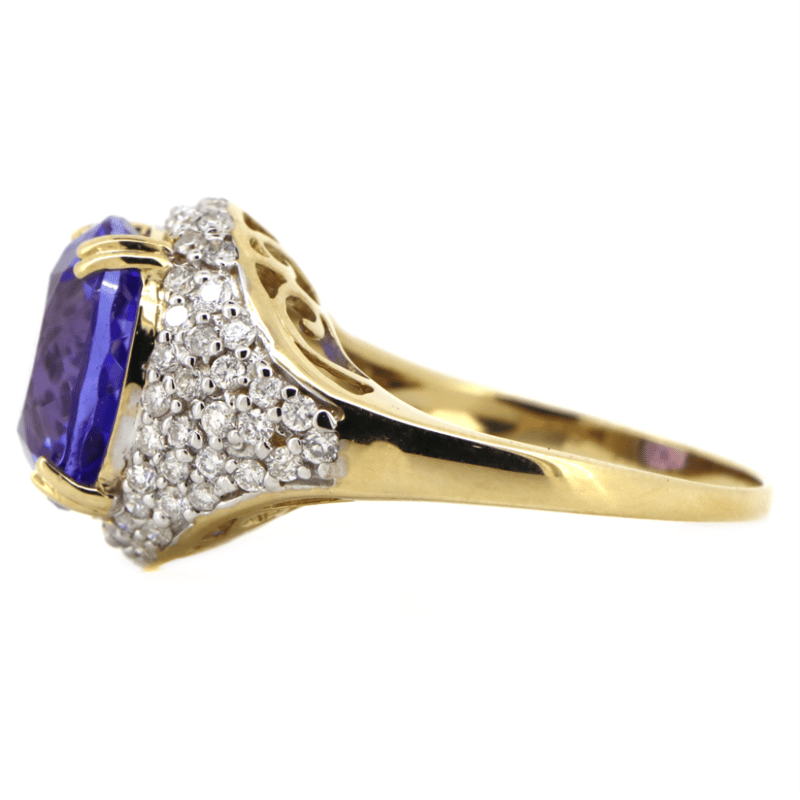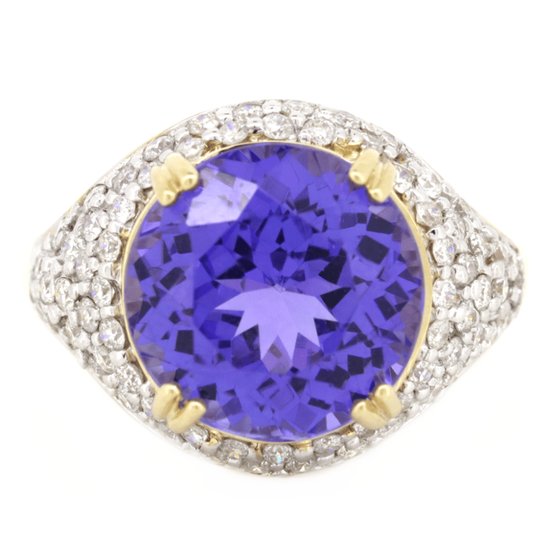 14K YELLOW GOLD, TANZANITE AND DIAMOND, CLUSTER RING. The Centre Features, One Round Cut, Purple Violet, Tanzanite (6.46Ct, Slightly Included, Enhanced), Double Claw Set. Embellishing The Design Are, 70 Round Brilliant Cut, Diamonds (0.68Ct Tdw, G-H Colour, Si1-Si2 Clarity), Pave Set In White Gold. Ring Size M 1/2. Valuations Provided by an Independent Third-Party Professional Not Directly Associated With Lloyds Auctions at AUD $$29,000.00This valuation has been conducted by an independent third-party professional. The valuation amount is an assessment by the issuing valuer and does not reflect the auction value of the item. Any inquiries regarding the valuation should be directed to the issuing valuer (refer to contact details on the certificate), as Lloyds Auctions has no affiliation or influence over the valuation, the valuer, or the stated amount. Condition: Good - Refer Images 0645844+5050