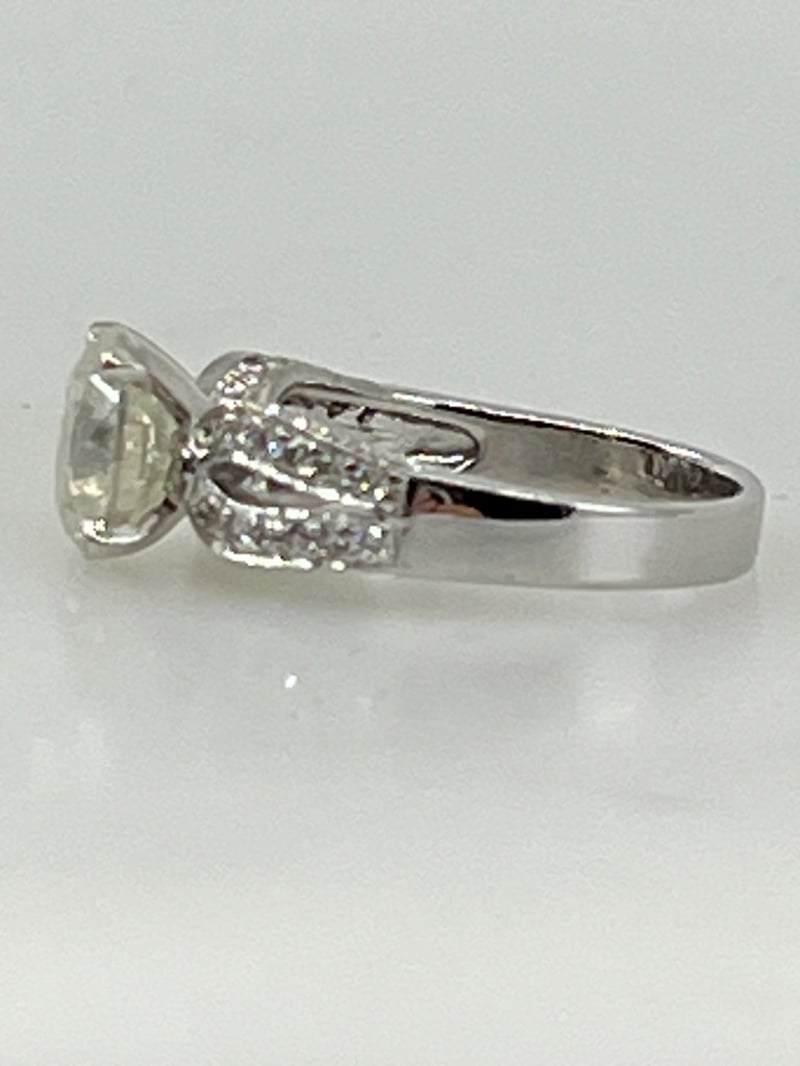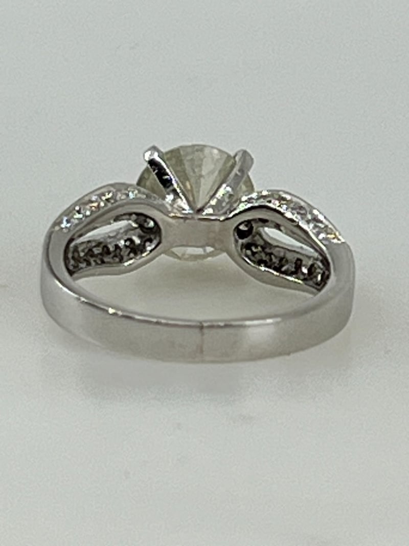 1 Round Brilliant Cut Diamond Set In X 4 Claws With X 24 Round Brilliant Cut Pave Set Dia- Monds On Each Side Of The Band With X 1 Round Brilliant Cut Bezel Set Diamond On Each Shoulder. The Design Features A Split Curved Band.