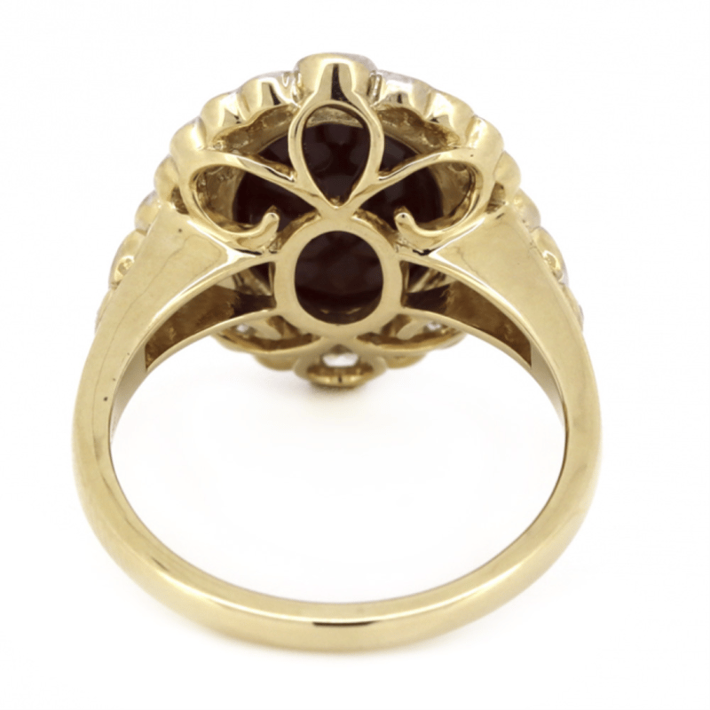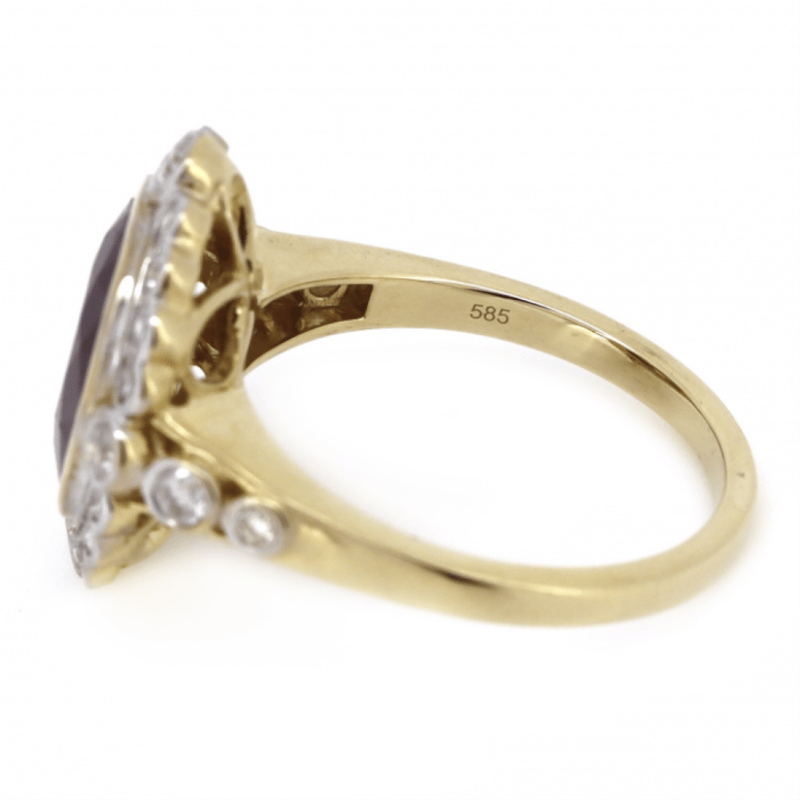 14K YELLOW GOLD, RUBY AND DIAMOND, HALO RING. The Centre Features, One Oval Cut, Purplish-Red, Ruby (3.50Ct, Included), Bezel Set. Surrounding The Centre In A Halo And Decorating The Shoulders Are, 24 Round Brilliant Cut, Diamonds (0.55Ct Tdw, J-K Colour, Si2-I2 Clarity), Bezel/Bead Set In White Gold. Ring Size O 1/2. The Ruby Has Some Natural Inclusions That Have Reached The Surface. Valuations Provided by an Independent Third-Party Professional Not Directly Associated With Lloyds Auctions at AUD $$12,390.00This valuation has been conducted by an independent third-party professional. The valuation amount is an assessment by the issuing valuer and does not reflect the auction value of the item. Any inquiries regarding the valuation should be directed to the issuing valuer (refer to contact details on the certificate), as Lloyds Auctions has no affiliation or influence over the valuation, the valuer, or the stated amount. Condition: Good - Refer Images 0645845+1570
