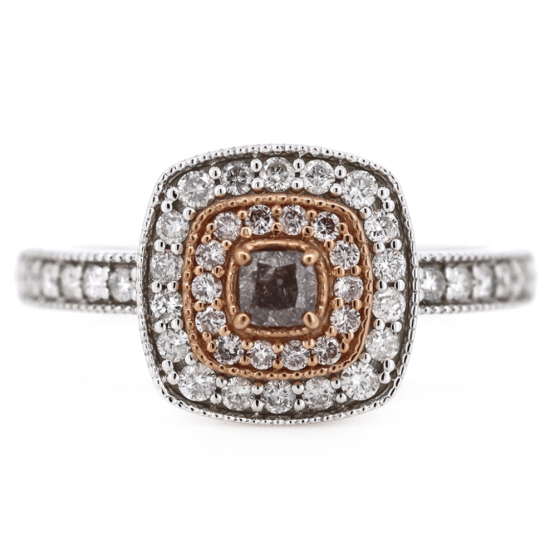14K WHITE/ROSE GOLD, PINK DIAMOND AND DIAMOND, DOUBLE HALO RING. The Center Features, One Cushion Cut, Pink-Champagne, Diamond (0.15Ct, Si1 Clarity), 4 Claw Set In Rose Gold. Surrounding The Centre In A Halo Are, 14 Round Brilliant Cut, Blush Pink, Diamonds (0.075Ct Tdw, Si-P1 Clarity), Micro-Bead Set In Rose Gold With Millegrain Detail. Embellishing The Design And Band Are, 30 Round Brilliant Cut, Diamonds (0.335Ct Tdw, H-K Colour, P2+ Clarity), Bead Set In White Gold With A Millegrain Detail. Ring Size M 1/2. Valuations Provided by an Independent Third-Party Professional Not Directly Associated With Lloyds Auctions at AUD $$12,500.00This valuation has been conducted by an independent third-party professional. The valuation amount is an assessment by the issuing valuer and does not reflect the auction value of the item. Any inquiries regarding the valuation should be directed to the issuing valuer (refer to contact details on the certificate), as Lloyds Auctions has no affiliation or influence over the valuation, the valuer, or the stated amount. Condition: Good - Refer Images 0645845+1572