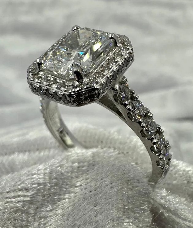 18K WHITE GOLD RING WITH RADIANT CUT LAB GROWN DIAMOND.Centre Stone: Igi Certified Radiant Cut Lab Grown Diamond Shape: Radiant Cut Specs: 2.01 Ct D/Vvs2, Ex Polish, Ex Symmetry, No Fluorescence 100% Eye Clean And Non Cloudy Setting: 18K White Gold Ring 56 X 0.005 Ct Round Natural Mined Diamonds On The Halo 10 X 0.07 Ct Round Natural Mined Diamonds On The Band Diamond Quality: F/Si Minimum Total Carat Weight On Band: 0.98 Carats Approx Finger Size: O1/2Igi Cert# Lg695522312Condition: Good - Refer To ImagesCROSSDOCK162955+37