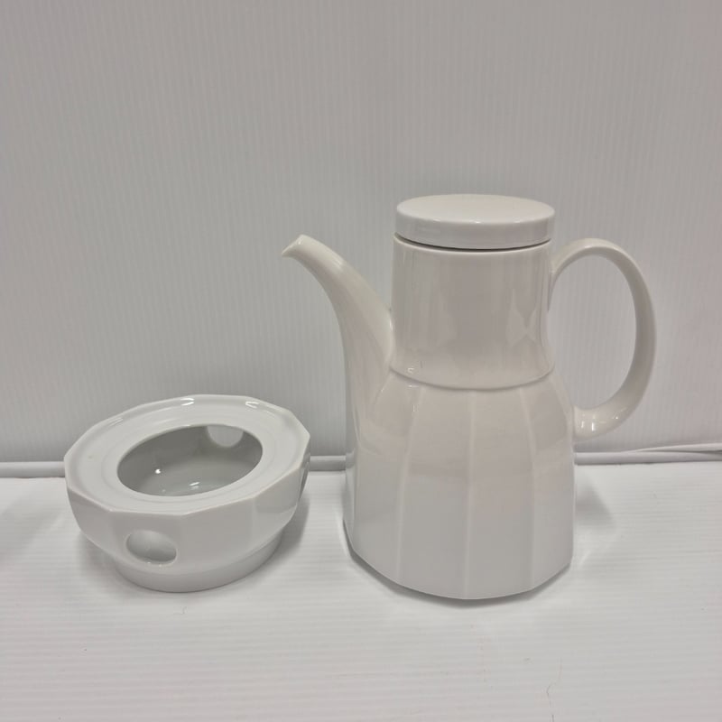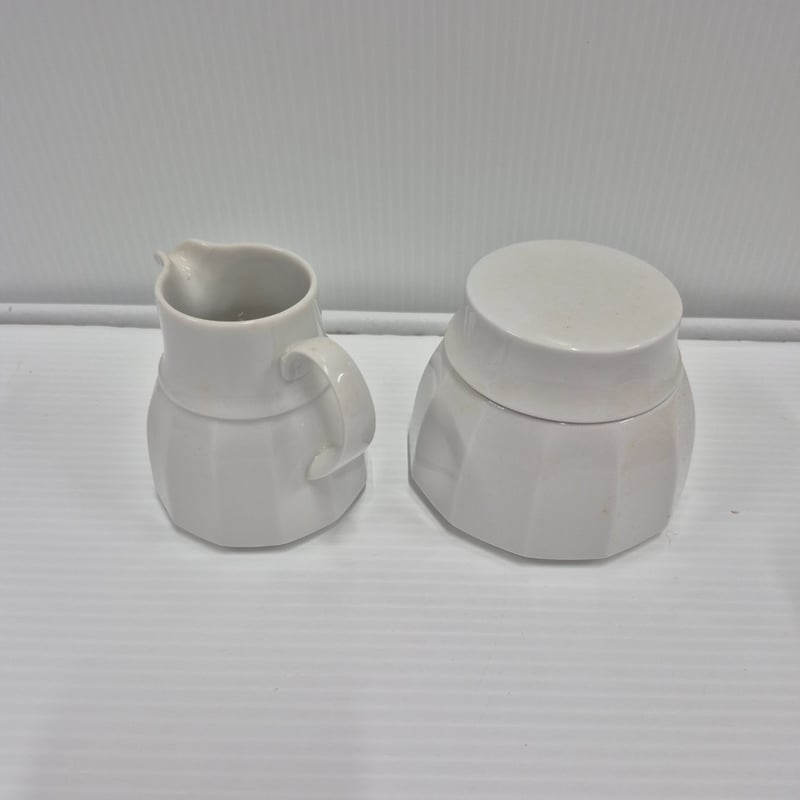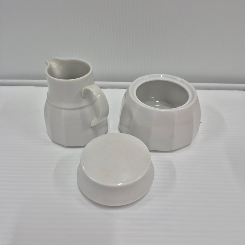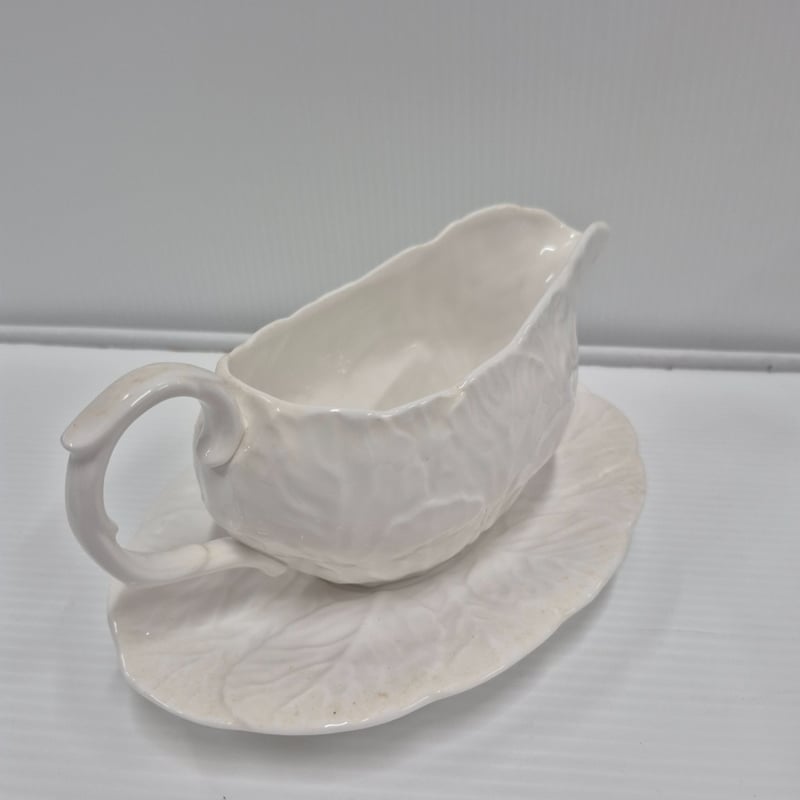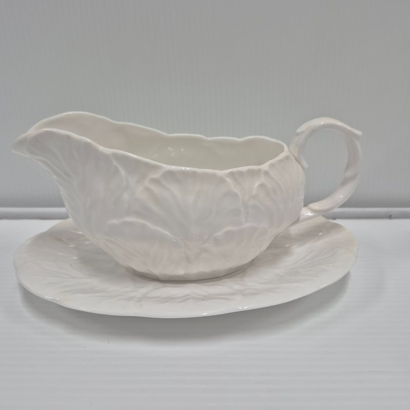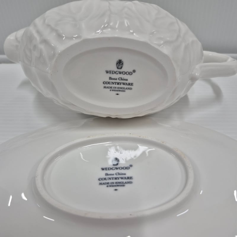 VINTAGE WHITE COFFEE SET & WEDGEWOOD GRAVY BOAT WITH SAUCER