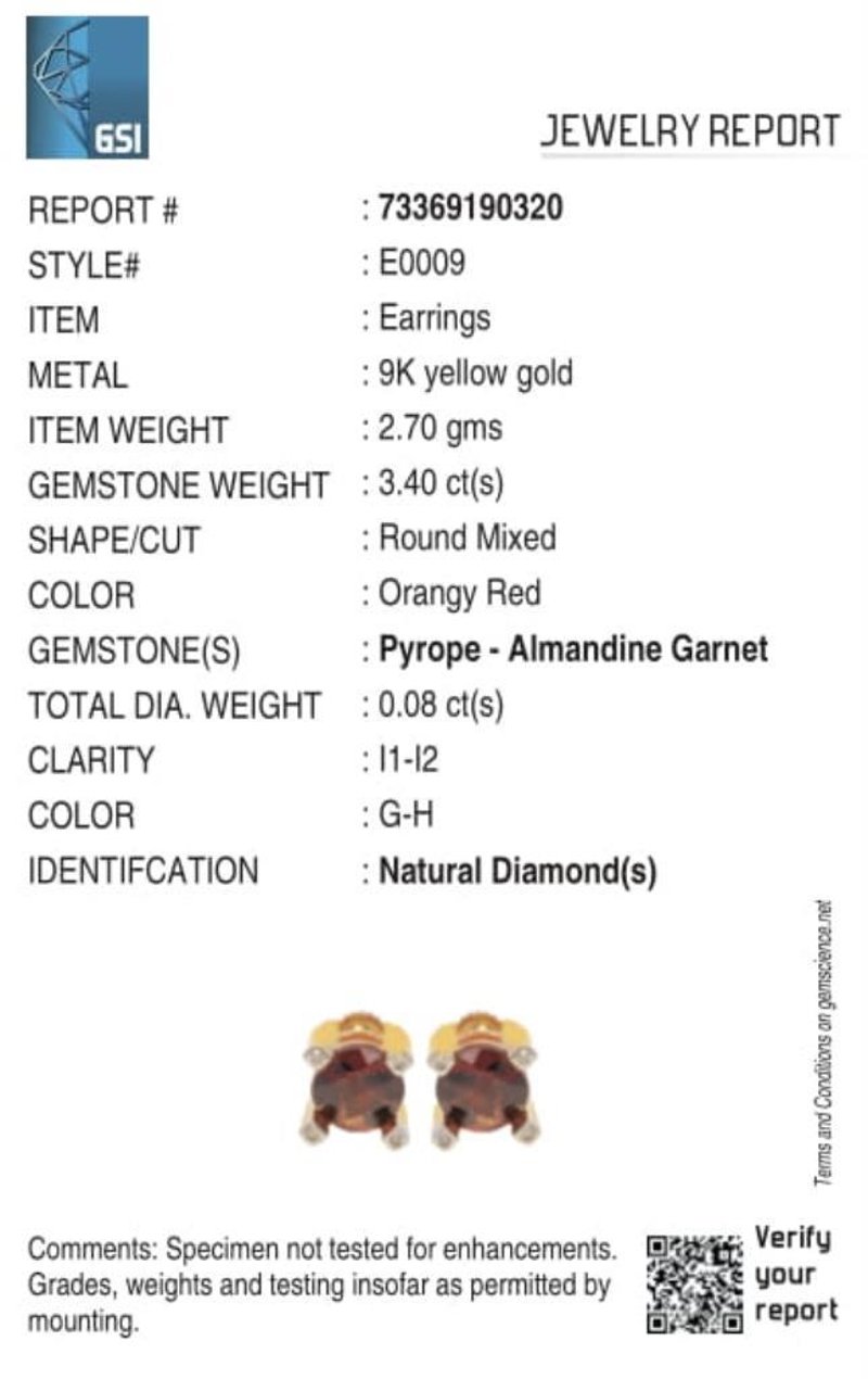 9CT YELLOW GOLD NATURAL GARNET & DIAMOND EARRINGS Weight Of The Item: 2.7 GFineness Of Metal(S): Yellow Gold 9KtThe Earrings Consists Of (2) Round Brilliant Natural Garnet. Surrounding The Main Stones Are Round Brilliant Cut Natural Diamonds.Antique StyleIdentification: Natural GarnetColor: RedShape: Round Brilliant CutNo. Of Stone: 2Dimension: 7 Mm X 7 Mm X 4.2 MmWeight: 3.4 CaratsCut: Very GoodIdentification: Natural DiamondShape: Round Brilliant CutWeight: 0.08 CtsCut: Excellent. Certificates Are Provided By Gemological Science International (Gsi), An Independent Third-Party Gemological Laboratory Based In The Usa And Recognised Among The Top 10 Gem Labs Globally Condition: Good - Refer Images 0488266+20
