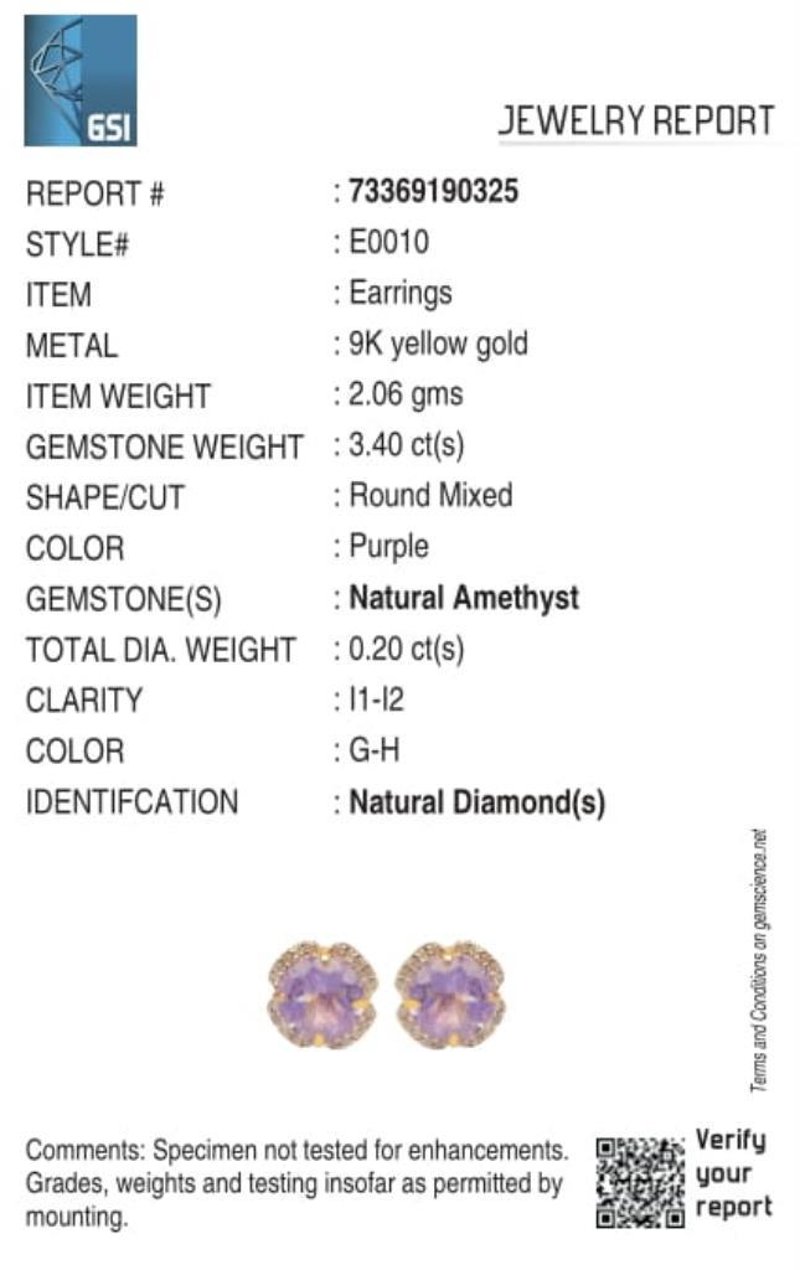 9CT YELLOW GOLD NATURAL AMETHYST & DIAMOND EARRINGS Weight Of The Item: 2.06 GFineness Of Metal(S): Yellow Gold 9KtThe Earrings Consists Of (2) Round Brilliant Natural Amethyst. Surrounding The Main Stones Are Round Brilliant Cut Natural Diamonds.Antique StyleIdentification: Natural AmethystColor: PurpleShape: Round Brilliant CutNo. Of Stone: 2Dimension: 8 Mm X 8 Mm X 4.8 MmWeight: 3.4 CaratsCut: Very GoodIdentification: Natural DiamondShape: Round Brilliant CutWeight: 0.2 CtsCut: Excellent. Certificates Are Provided By Gemological Science International (Gsi), An Independent Third-Party Gemological Laboratory Based In The Usa And Recognised Among The Top 10 Gem Labs Globally Condition: Good - Refer Images 0488266+23