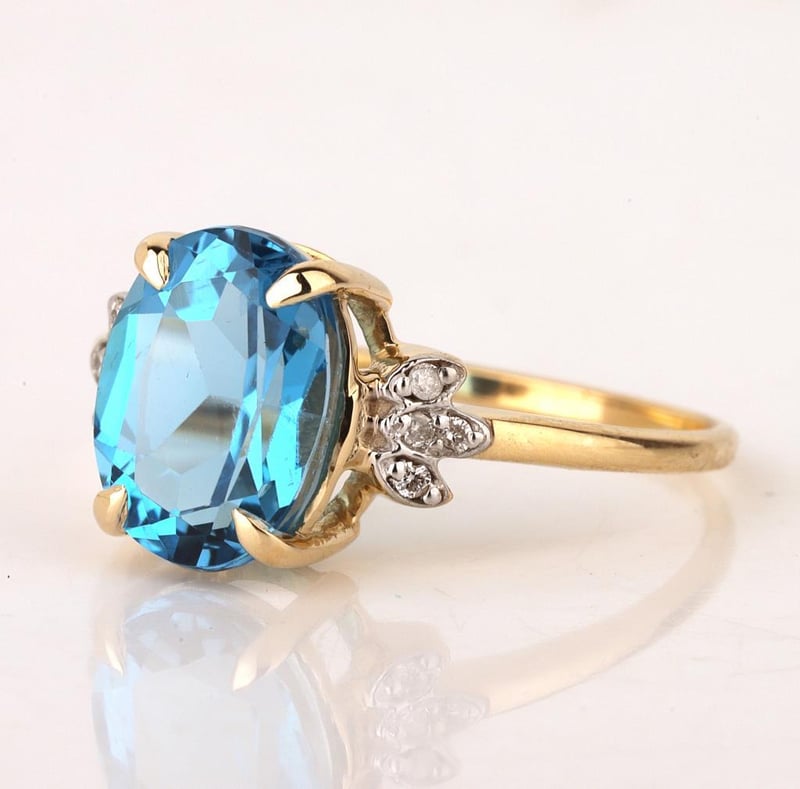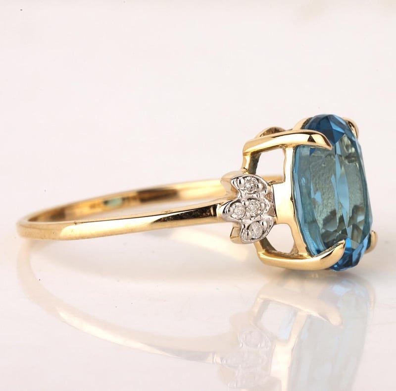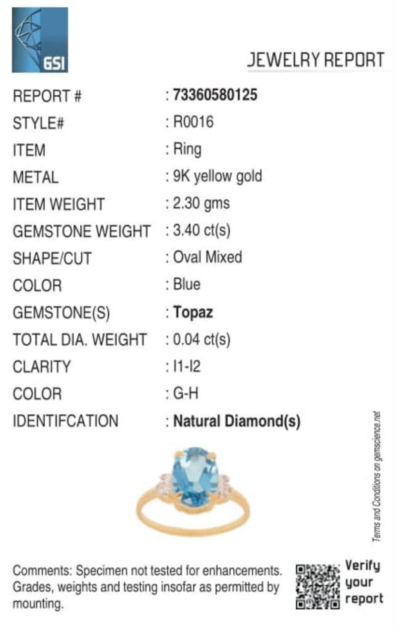 9CT YELLOW GOLD NATURAL SWISS BLUE TOPAZ & DIAMOND RING Weight Of The Item: 2.3 GFineness Of Metal(S): Yellow Gold 9KtThe Ring Consists Of (1) Oval Brilliant Natural Swiss Blue Topaz. Surrounding The Main Stones Are Round Brilliant Cut Natural Diamonds.Antique StyleIdentification: Natural Swiss Blue TopazColor: BlueShape: Oval Brilliant CutNo. Of Stone: 1Dimension: 10 Mm X 8 Mm X 6 MmWeight: 3.4 CaratsCut: Very GoodIdentification: Natural DiamondShape: Round Brilliant CutWeight: 0.04 CtsCut: Excellent. Certificates Are Provided By Gemological Science International (Gsi), An Independent Third-Party Gemological Laboratory Based In The Usa And Recognised Among The Top 10 Gem Labs Globally Condition: Good - Refer Images 0488266+36