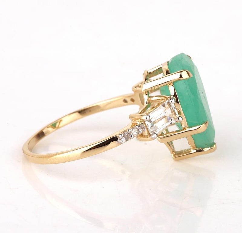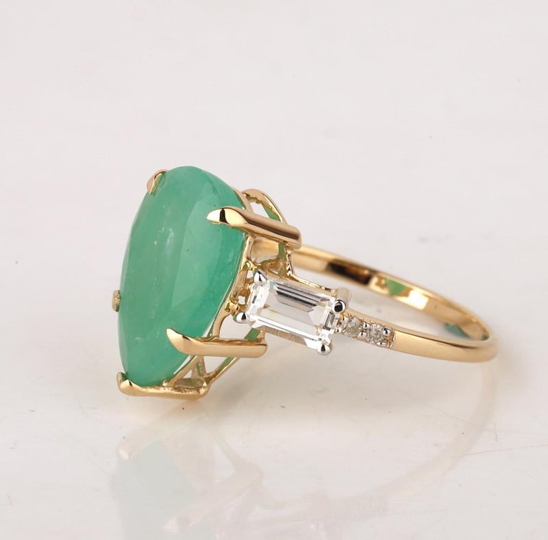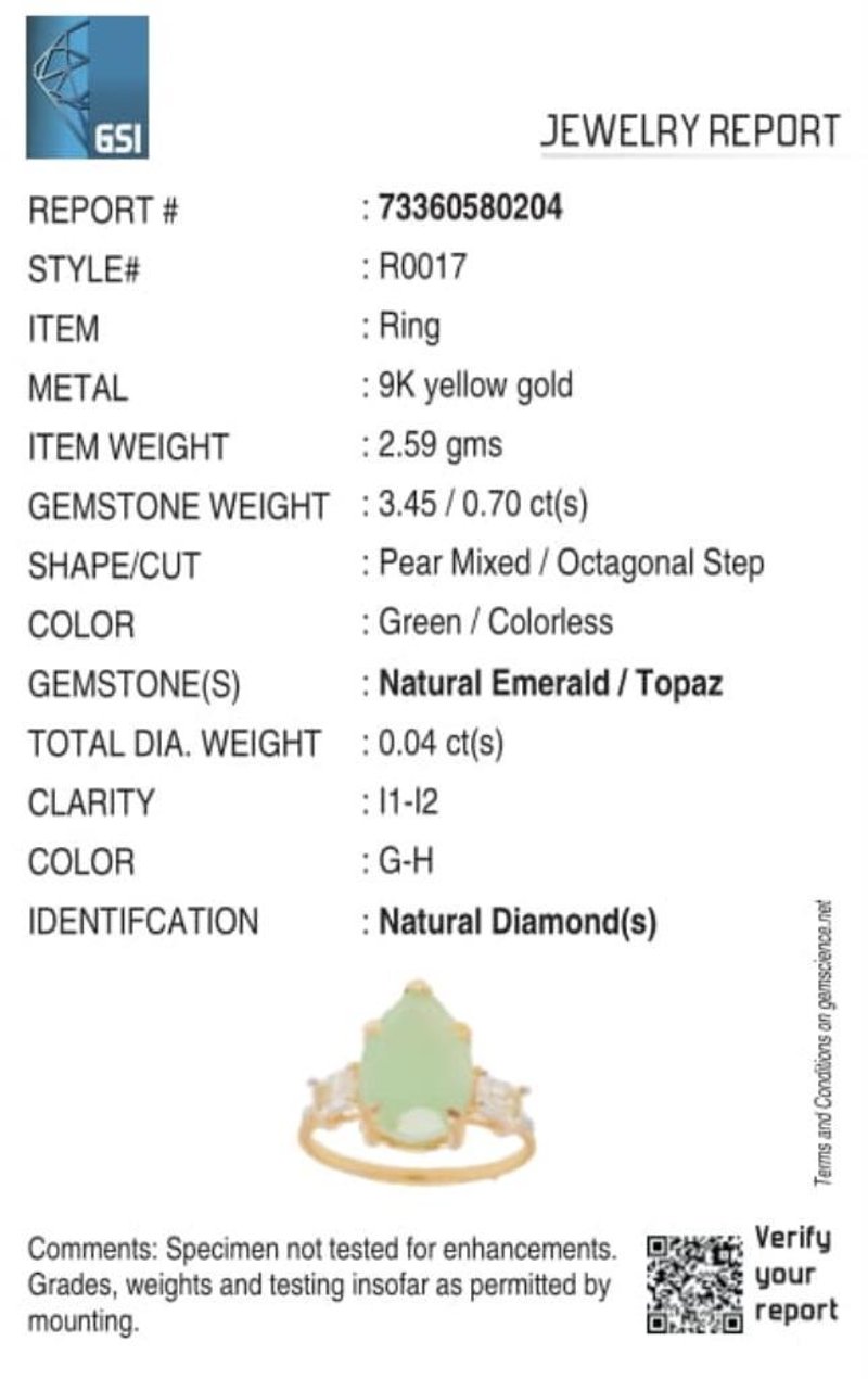 9CT YELLOW GOLD NATURAL EMERALD / NATURAL WHITE TOPAZ & DIAMOND RING Weight Of The Item: 2.59 GFineness Of Metal(S): Yellow Gold 9KtThe Ring Consists Of (1) Pear Brilliant Natural Emerald & (2) Baguette Step Cut White Topaz. Surrounding The Main Stones Are Round Brilliant Cut Natural Diamonds.Antique StyleIdentification: Natural Emerald / Natural White TopazColor: Green / WhiteShape: Pear Brilliant Cut / Baguette Faceted CutNo. Of Stone: 3Dimension: 12 Mm X 9 Mm X 7.2 MmWeight: 3.45 Carats / 0.7 CaratsCut: Very GoodIdentification: Natural DiamondShape: Round Brilliant CutWeight: 0.04 CtsCut: Excellent. Certificates Are Provided By Gemological Science International (Gsi), An Independent Third-Party Gemological Laboratory Based In The Usa And Recognised Among The Top 10 Gem Labs Globally Condition: Good - Refer Images 0488266+38
