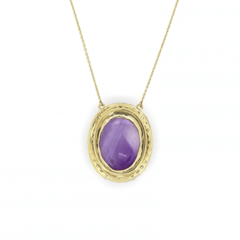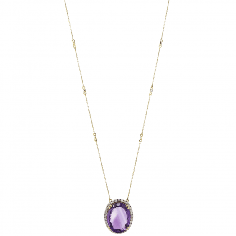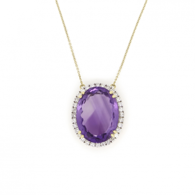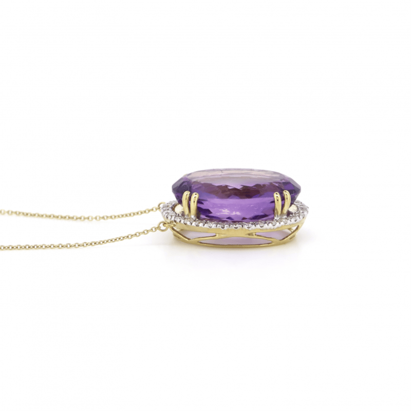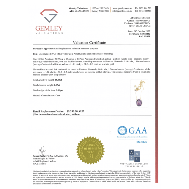 10K YELLOW GOLD, 18.38CT AMETHYST AND DIAMOND, STATEMENT NECKLACE. The Central Design Features, One Oval Cut, Medium Pinkish-Purple, Amethyst (18.38Ct, Minor Eye Visible Inclusions), Double Claw Set. Surrounding The Amethyst In A Halo And Decorating The Chain Are, 38 Round Brilliant Cut, Diamonds (0.85Ct Tdw, J-K Colour, Si2-I2 Clarity), Bead/Bezel Set In White Gold. The Necklace Has A Lobster Claw Clasp. Chain Length Is 54Cm. Valuations Provided by an Independent Third-Party Professional Not Directly Associated With Lloyds Auctions at AUD $$9,290.00This valuation has been conducted by an independent third-party professional. The valuation amount is an assessment by the issuing valuer and does not reflect the auction value of the item. Any inquiries regarding the valuation should be directed to the issuing valuer (refer to contact details on the certificate), as Lloyds Auctions has no affiliation or influence over the valuation, the valuer, or the stated amount. Condition: Good - Refer Images 0645845+1578