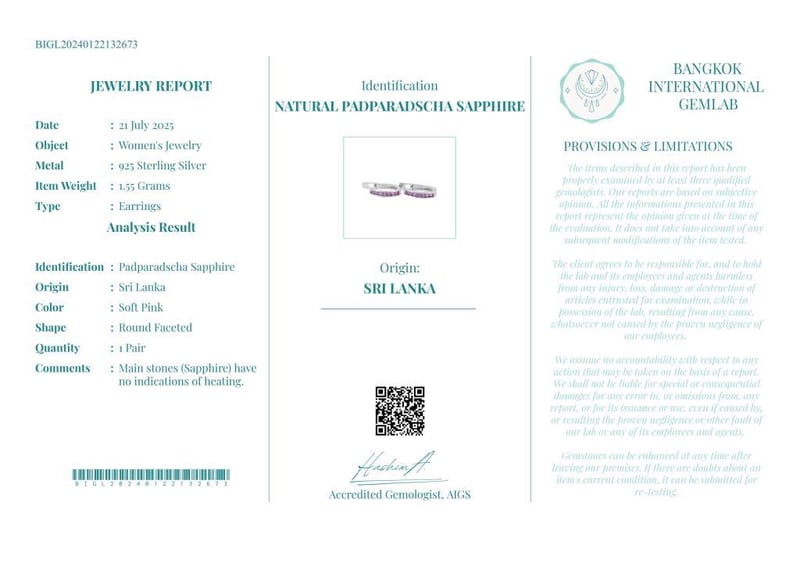 NATURAL PADPARADSCHA SAPPHIRE (UNHEATED) EARRINGS ON 925 SILVER - WITH DIGITAL CERTIFICATE ONLY Gemstone : Natural Padparadscha Sapphire (Unheated)Certificate (Digital): Bigl20240122132673Item Total Weight : 1.55 GramsMain Stone Color : Soft PinkSize : Comments : Main Stones (Sapphire) Have No Indications Of Heating.✻ Verify Report Online At Www.Bangkokinternationalgemlab.Co Condition: Good - Refer Images 01611139+14