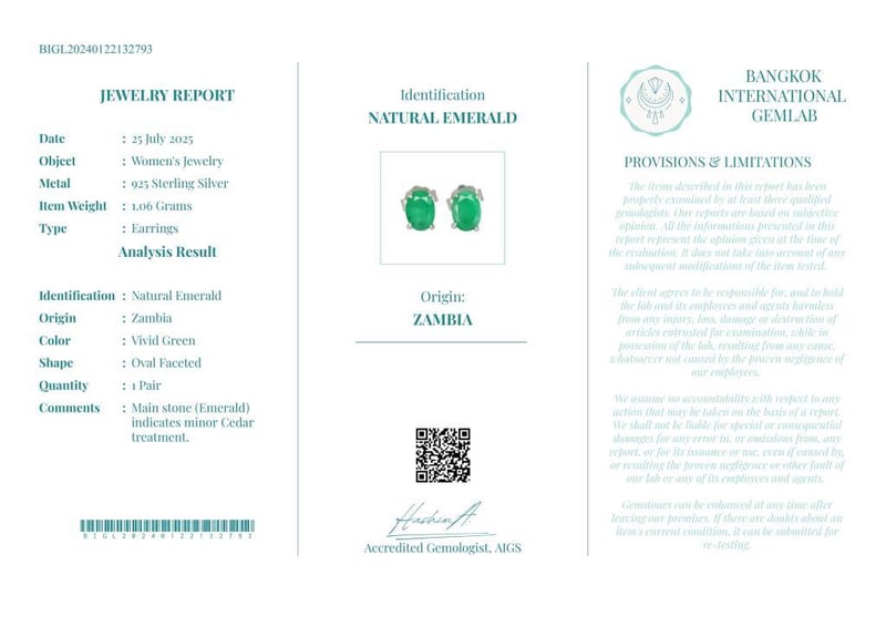 NATURAL ZAMBIAN EMERALD EARRINGS ON 925 SILVER - WITH DIGITAL CERTIFICATE ONLY Gemstone : Natural Zambian EmeraldCertificate (Digital): Bigl20240122132793Item Total Weight : 1.06 GramsMain Stone Color : Vivid GreenSize : Comments : Main Stone (Emerald) Indicates Minor Cedar Treatment.✻ Verify Report Online At Www.Bangkokinternationalgemlab.Co Condition: Good - Refer Images 01611139+22