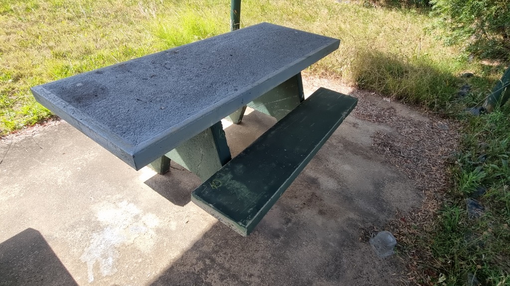 Concrete park Bench With Metal Edging Grey Top with Green Seats and Legs Dimensions: 190cmW x 83cmH x 140cmD NOTE: Can Be Partially Disassembled By Buyer, Item is Heavy and will require Tools And Manual Handling Equipment Contact Tammy PH: 0458981629 Inspections Via Appointment 28/10/2025 Collections Monday 3/11/2025
