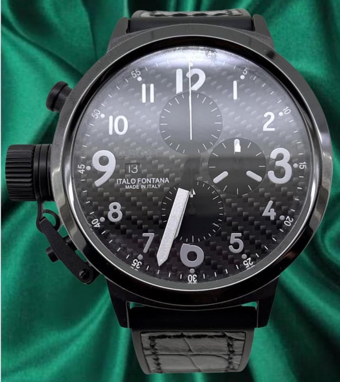 UBOAT BP FIGHT TANK 50 U-7750/50 2014 Price Guide - Circa $3,000 REFERENCE NO: U-7750/50 PRODUCTION YEAR: 2014 DIAL: CATBONFIBER CASE DESCRIPTION: STAINLESS STEEL CASE SIZE: 50MM BRACELET: LEATHER MOVEMENT: AUTOMATIC BOX: Box Included PAPERS: Papers Included Condition: Used - Refer Images SR