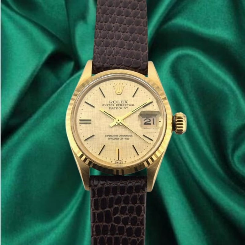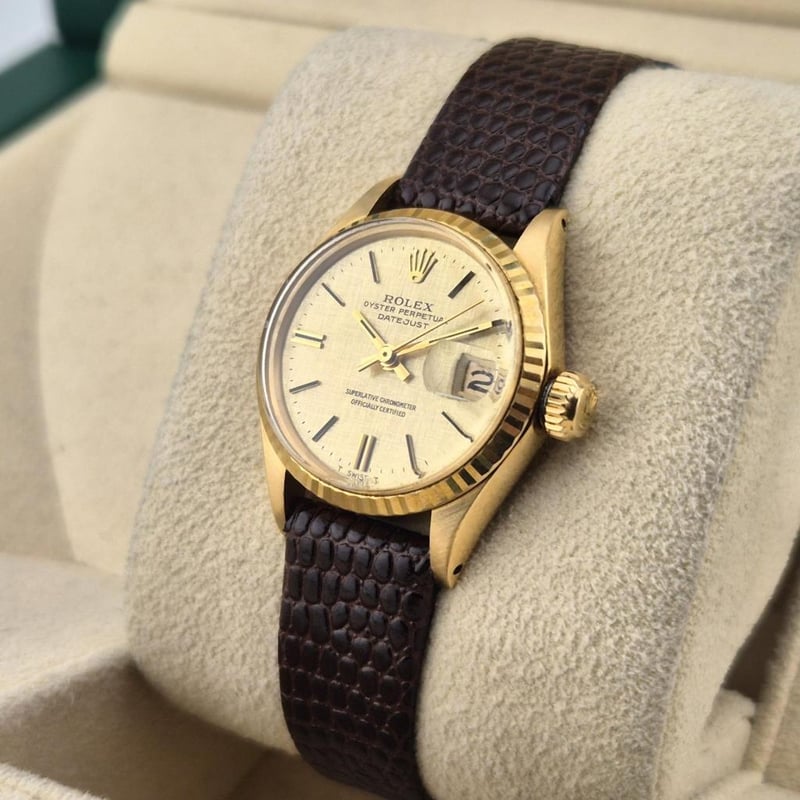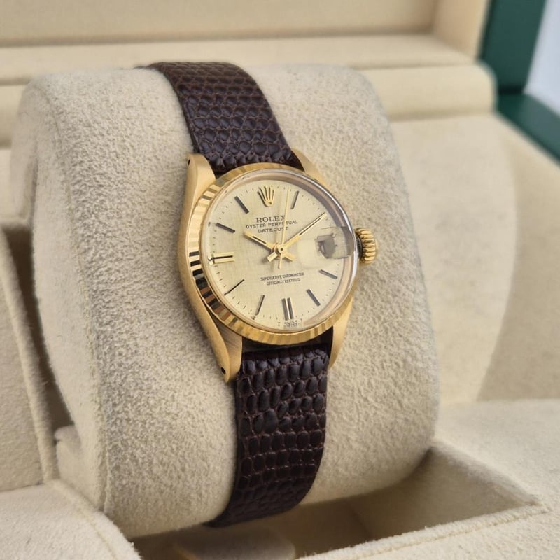 ROLEX 6517 LADY DATEJUST 18K YELLOW GOLD LINEN DIAL 26MM BOX & COA Price Guide - $6,500 - $circa Brand: Rolex Reference: 6517 Model: Lady Datejust 18K Yellow Gold Linen Dial Case Size: 26Mm Circa: 1969 Vintage Movement: Automatic Condition: Good Vintage Box: Yes Papers: No, Coa Provided Condition: Good - Refer Images 0 488298+9