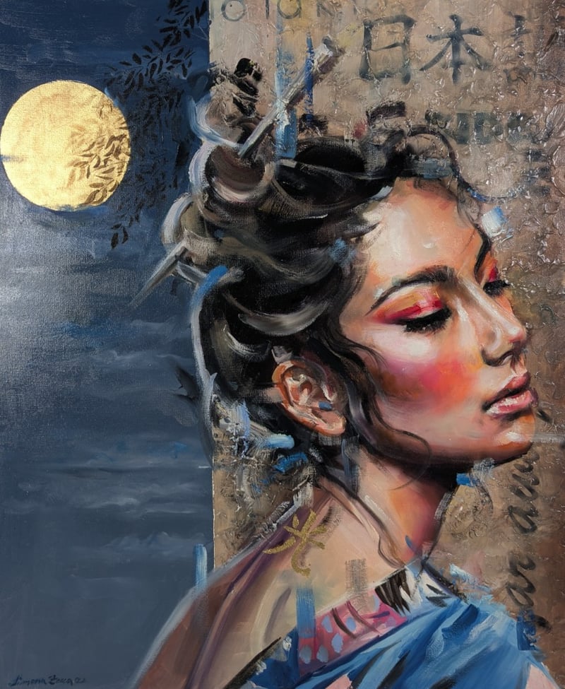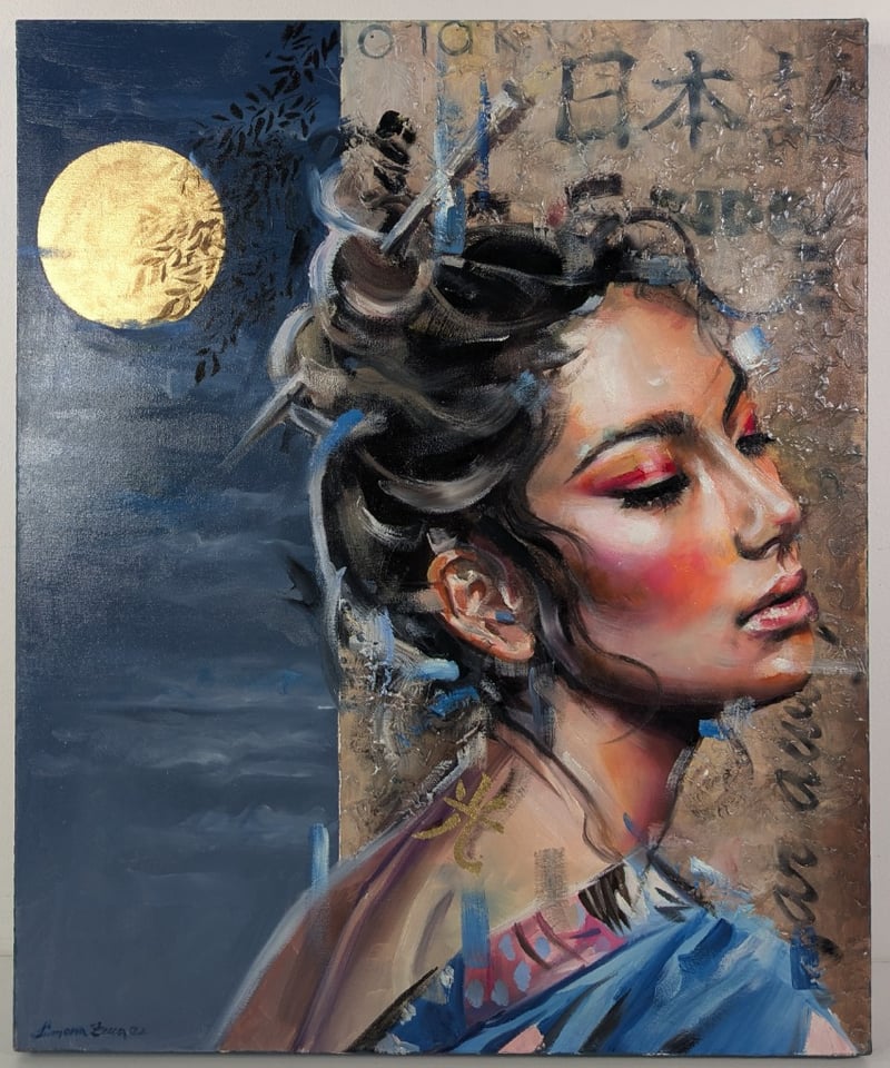 SIMONA ZECCA (1980 - )Original Mixed Media On CanvasTitle: Japan In Gold - TsukimiItem Size: Height: 60cm, Width: 50cmSignature Details: Signed Lower Left And VersoTitle And Date On VersoCondition: Good - Refer To ImagesArtwork Is Stretched And Ready To HangF1D162915+49