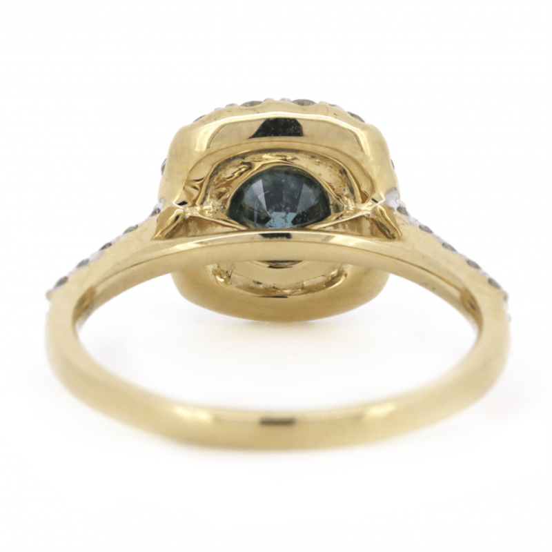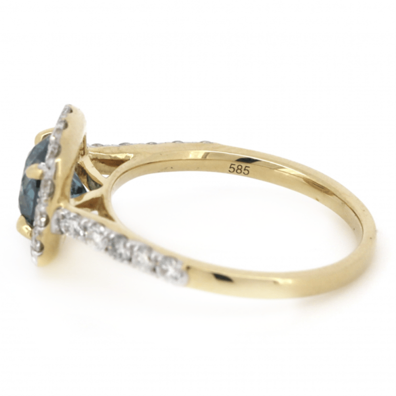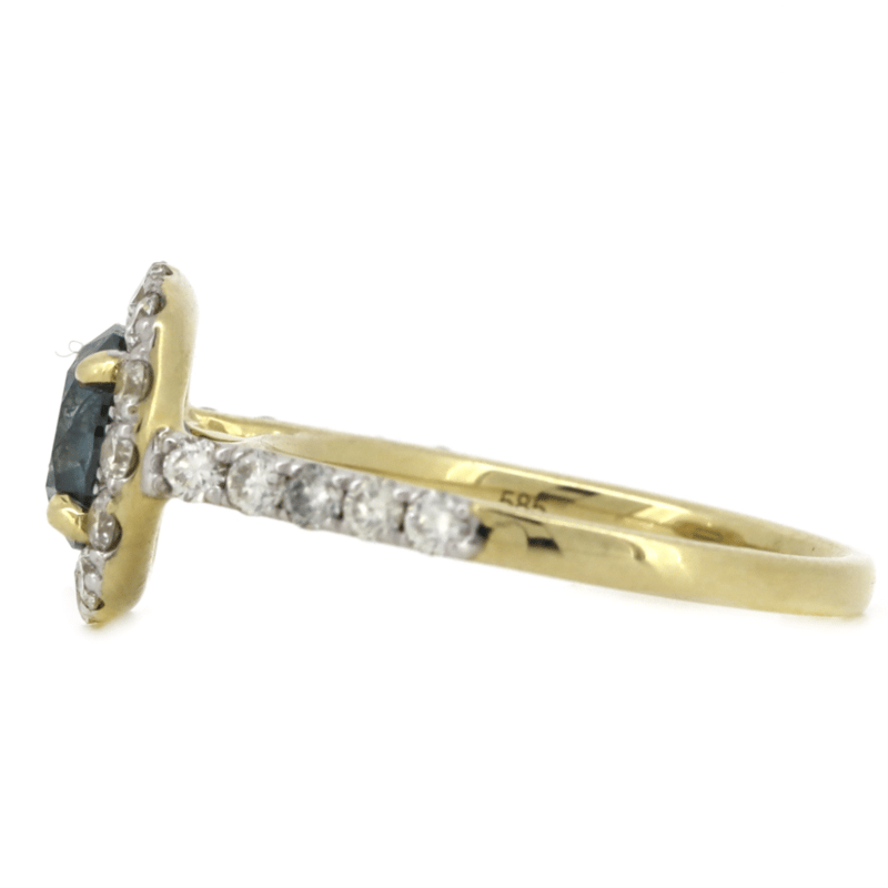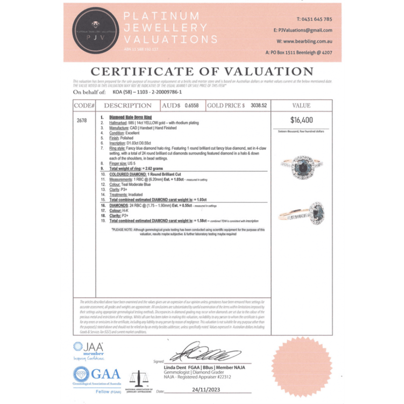 14K YELLOW GOLD, BLUE DIAMOND AND DIAMOND, HALO RING. The Centre Features One, Round Brilliant Cut, Teal Moderate Blue, Diamond (1.03Ct, P3+ Clarity, Irradiated), 4 Claw Set. Surrounding The Centre In A Halo And Decorating The Band Are, 24 Round Brilliant Cut Diamonds (0.55Ct Tdw, H-K Colour, P2+ Clarity), Bead Set. Ring Size J. Valuations Provided by an Independent Third-Party Professional Not Directly Associated With Lloyds Auctions at AUD $$16,400.00This valuation has been conducted by an independent third-party professional. The valuation amount is an assessment by the issuing valuer and does not reflect the auction value of the item. Any inquiries regarding the valuation should be directed to the issuing valuer (refer to contact details on the certificate), as Lloyds Auctions has no affiliation or influence over the valuation, the valuer, or the stated amount. Condition: Good - Refer Images 0645848+3238