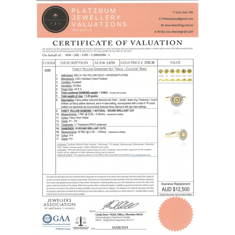 14K YELLOW GOLD, FANCY YELLOW DIAMOND, HALO RING. The Centre Features, One Round Brilliant Cut, Fancy Vivid Yellow, Diamond (0.69Ct, Colour- Treatment Observed, P1-P2 Clarity), 4 Claw Set. Surrounding The Centre In A Halo Are, 16 Round Brilliant Cut, Diamonds (0.26Ct Tdw, H-K Colour, P2+Clarity), Micro-Bead Set. Ring Size M 1/2. Valuations Provided by an Independent Third-Party Professional Not Directly Associated With Lloyds Auctions at AUD $$12,500.00This valuation has been conducted by an independent third-party professional. The valuation amount is an assessment by the issuing valuer and does not reflect the auction value of the item. Any inquiries regarding the valuation should be directed to the issuing valuer (refer to contact details on the certificate), as Lloyds Auctions has no affiliation or influence over the valuation, the valuer, or the stated amount. Condition: Good - Refer Images 0645848+3227