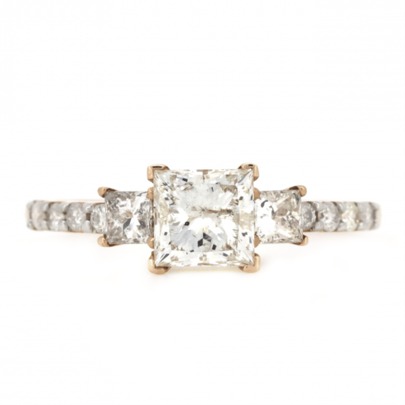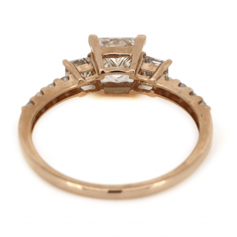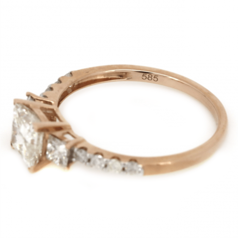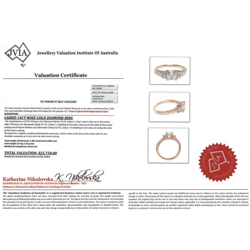 14K ROSE GOLD AND DIAMOND, DRESS RING. The Design Features, 3 Princess Cut, Diamonds (1.28Ct Tdw, I-J Colour, P1-P2 Clarity), Claw Set. Decorating The Band Are, 8 Round Brilliant Cut, Diamonds (0.12Ct Tdw, I-K Colour, Si2-P2 Clarity), Claw Set. Ring Size M. Valuations Provided by an Independent Third-Party Professional Not Directly Associated With Lloyds Auctions at AUD $$25,750.00This valuation has been conducted by an independent third-party professional. The valuation amount is an assessment by the issuing valuer and does not reflect the auction value of the item. Any inquiries regarding the valuation should be directed to the issuing valuer (refer to contact details on the certificate), as Lloyds Auctions has no affiliation or influence over the valuation, the valuer, or the stated amount. Condition: Good - Refer Images 0645848+3275