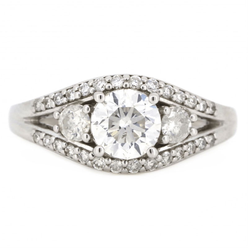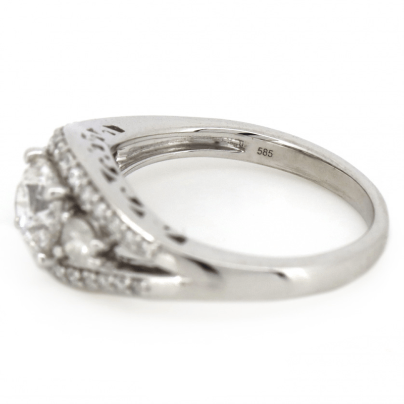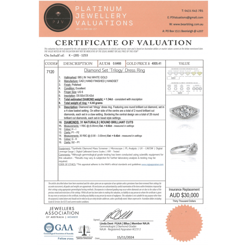 14K WHITE GOLD AND DIAMOND, TRILOGY RING. The Centre Features, One Round Brilliant Cut, Diamond (0.92Ct, H-I Colour, P1-P2 Clarity), Claw Set. Either Side Of The Centre Are, 2 Round Brilliant Cut, Diamonds (0.22Ct Tdw, G-H Colour, Si2-P1 Clarity), Claw Set. Bordering The Central Design Are, 28 Round Brilliant Cut, Diamonds (0.20Ct Tdw, G-H Colour, Si2-P1 Clarity), Bead Set. Ring Size M. Valuations Provided by an Independent Third-Party Professional Not Directly Associated With Lloyds Auctions at AUD $$30,000.00This valuation has been conducted by an independent third-party professional. The valuation amount is an assessment by the issuing valuer and does not reflect the auction value of the item. Any inquiries regarding the valuation should be directed to the issuing valuer (refer to contact details on the certificate), as Lloyds Auctions has no affiliation or influence over the valuation, the valuer, or the stated amount. Condition: Good - Refer Images 0645848+3280