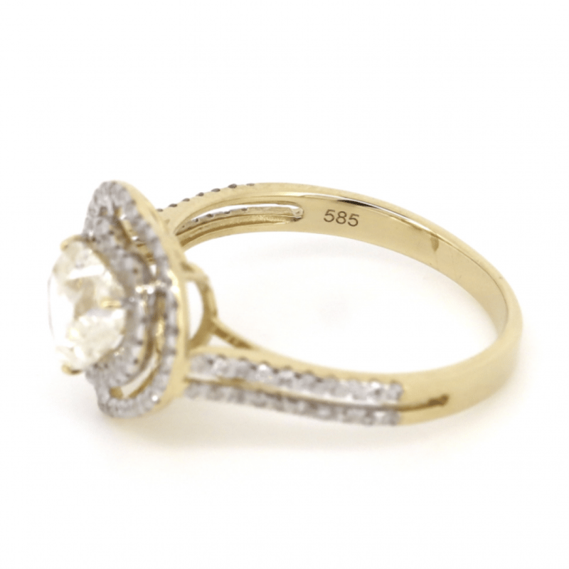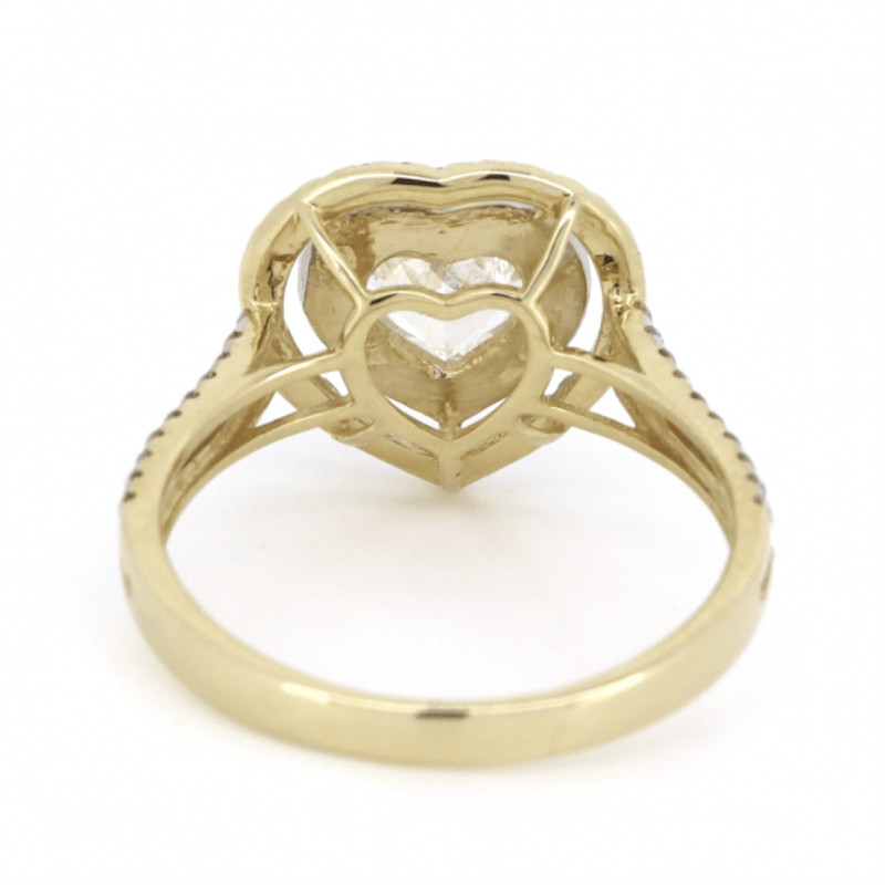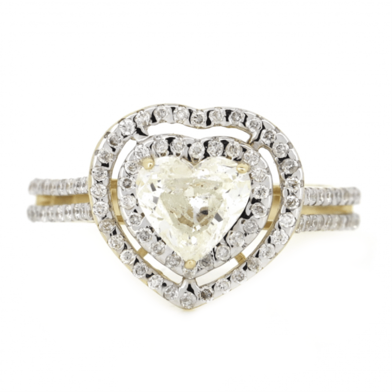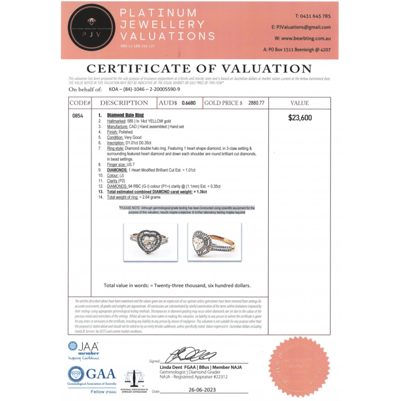 14K YELLOW GOLD AND DIAMOND, DOUBLE HALO SPLIT BAND RING. The Centre Features, One Heart Modified Brilliant Cut, Diamond (1.01Ct, J Colour, P2 Clarity), 4 Claw Set. Surrounding The Centre In A Double Halo And Decorating The Band Are, 94 Round Brilliant Cut, Diamonds (0.35Ct Tdw, G-I Colour, P1+ Clarity), Punch Set. Ring Size M 1/2. Valuations Provided by an Independent Third-Party Professional Not Directly Associated With Lloyds Auctions at AUD $$23,600.00This valuation has been conducted by an independent third-party professional. The valuation amount is an assessment by the issuing valuer and does not reflect the auction value of the item. Any inquiries regarding the valuation should be directed to the issuing valuer (refer to contact details on the certificate), as Lloyds Auctions has no affiliation or influence over the valuation, the valuer, or the stated amount. Condition: Good - Refer Images 0645848+3257