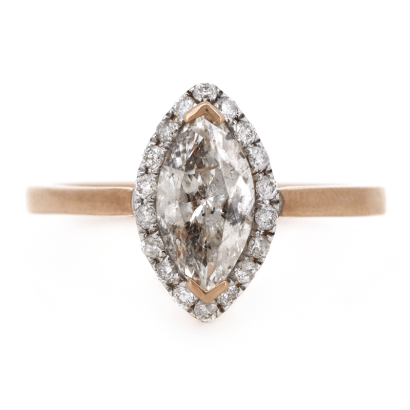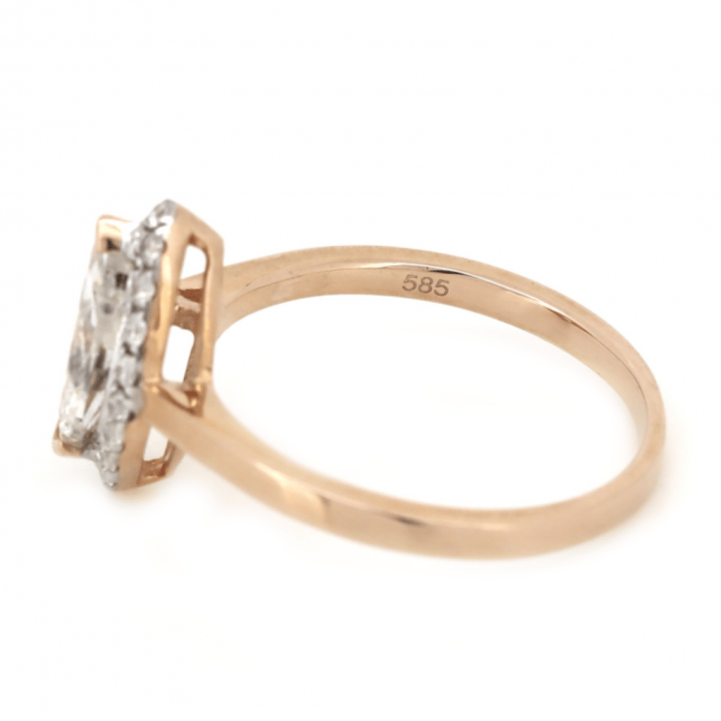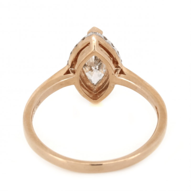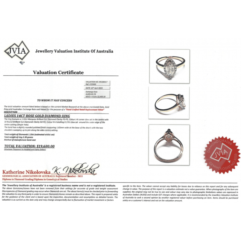 14K ROSE GOLD AND DIAMOND, HALO RING. The Centre Features, One Marquise Brilliant Cut, Diamond (1.02Ct, J-K Colour, P2-P3 Clarity), 6 Claw Set. Surrounding The Centre In A Halo Are, 18 Round Brilliant Cut, Diamonds (0.17Ct Tdw, H-J Colour, Si2-P2 Clarity), Claw Set. Ring Size M. Valuations Provided by an Independent Third-Party Professional Not Directly Associated With Lloyds Auctions at AUD $$19,680.00This valuation has been conducted by an independent third-party professional. The valuation amount is an assessment by the issuing valuer and does not reflect the auction value of the item. Any inquiries regarding the valuation should be directed to the issuing valuer (refer to contact details on the certificate), as Lloyds Auctions has no affiliation or influence over the valuation, the valuer, or the stated amount. Condition: Good - Refer Images 0645848+3265