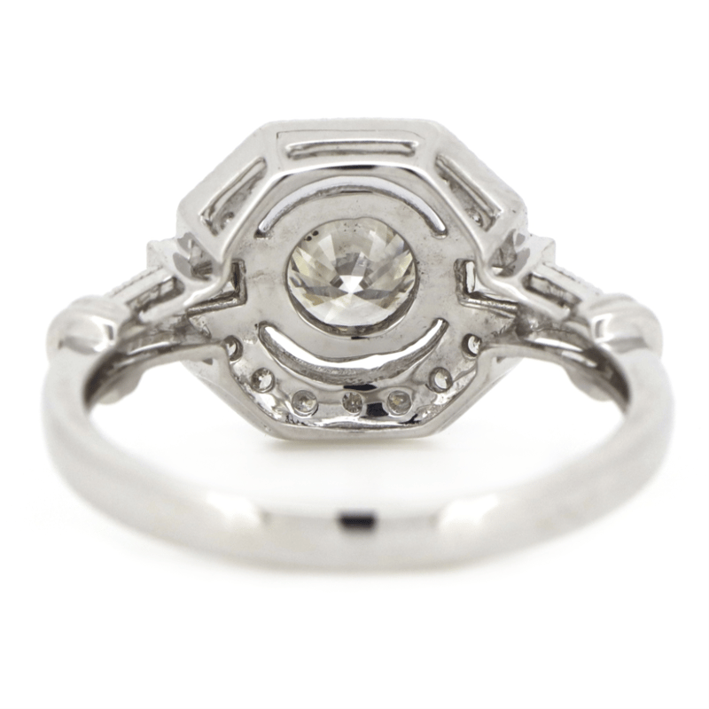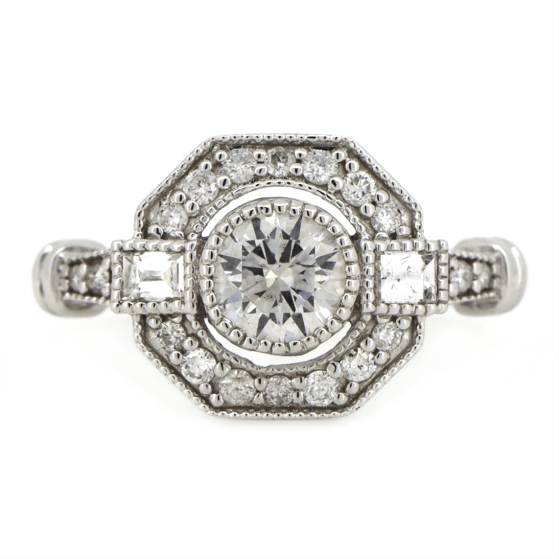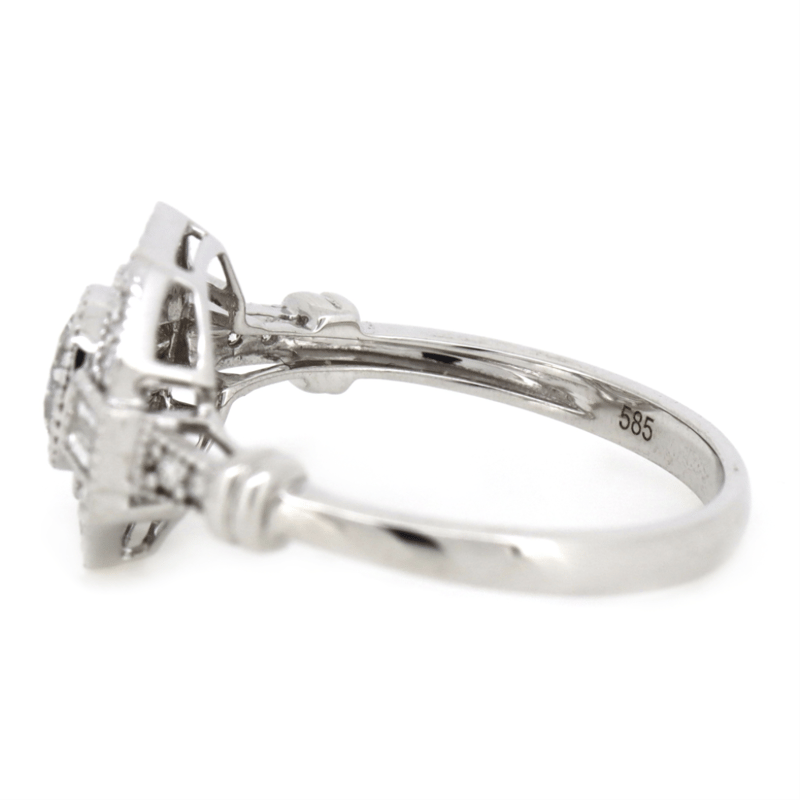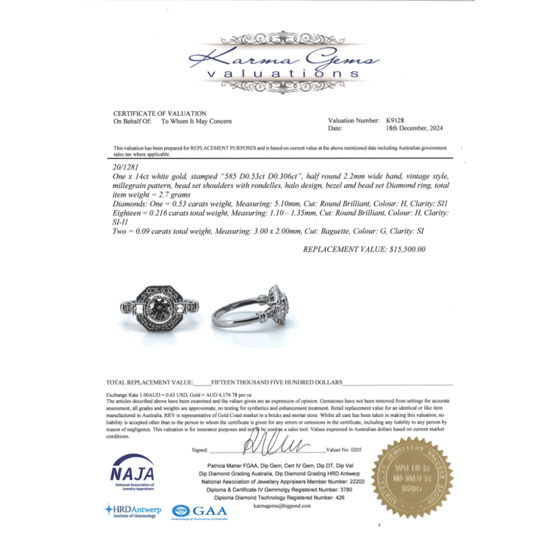 14K WHITE GOLD AND DIAMOND, DRESS RING. The Centre Features, One Round Brilliant Cut, Diamond (0.53Ct, H Colour, Si1 Clarity), Bezel Set With Millegrain Detail. Flanked By, 2 Baguette Cut, Diamonds (0.09Ct Tdw, G Colour, Si Clarity), Bezel Set With Millegrain Detail. Surrounding The Centre And Decorating The Band Are, 18 Round Brilliant Cut, Diamonds (0.216Ct Tdw, H Colour, Si-I1 Clarity), Bead Set In White Gold With Millegrain Detail. Ring Size M. Valuations Provided by an Independent Third-Party Professional Not Directly Associated With Lloyds Auctions at AUD $$15,500.00This valuation has been conducted by an independent third-party professional. The valuation amount is an assessment by the issuing valuer and does not reflect the auction value of the item. Any inquiries regarding the valuation should be directed to the issuing valuer (refer to contact details on the certificate), as Lloyds Auctions has no affiliation or influence over the valuation, the valuer, or the stated amount. Condition: Good - Refer Images 0645848+3277