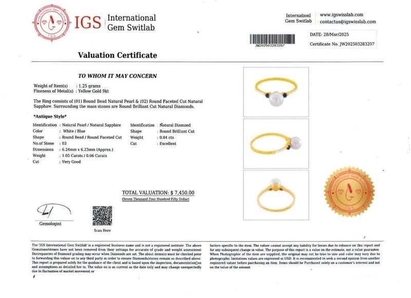 9CT YELLOW GOLD PEARL SAPPHIRE DIAMOND RING Date : 27 -03-2025 Category: Ring Comment: Yellow Gold 9K Natural Pearl : 1.05 Carat Natural Sapphire : 0.06 Carat Natural Diamond : 0.04 Carat Item Weight : 1.25 G Condition: Good - Refer Images 283207 488285+283207