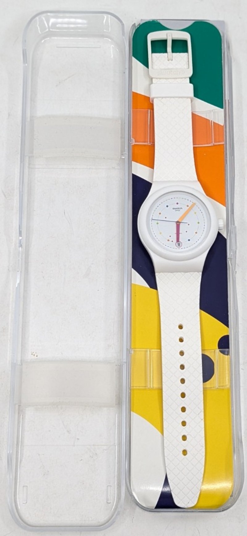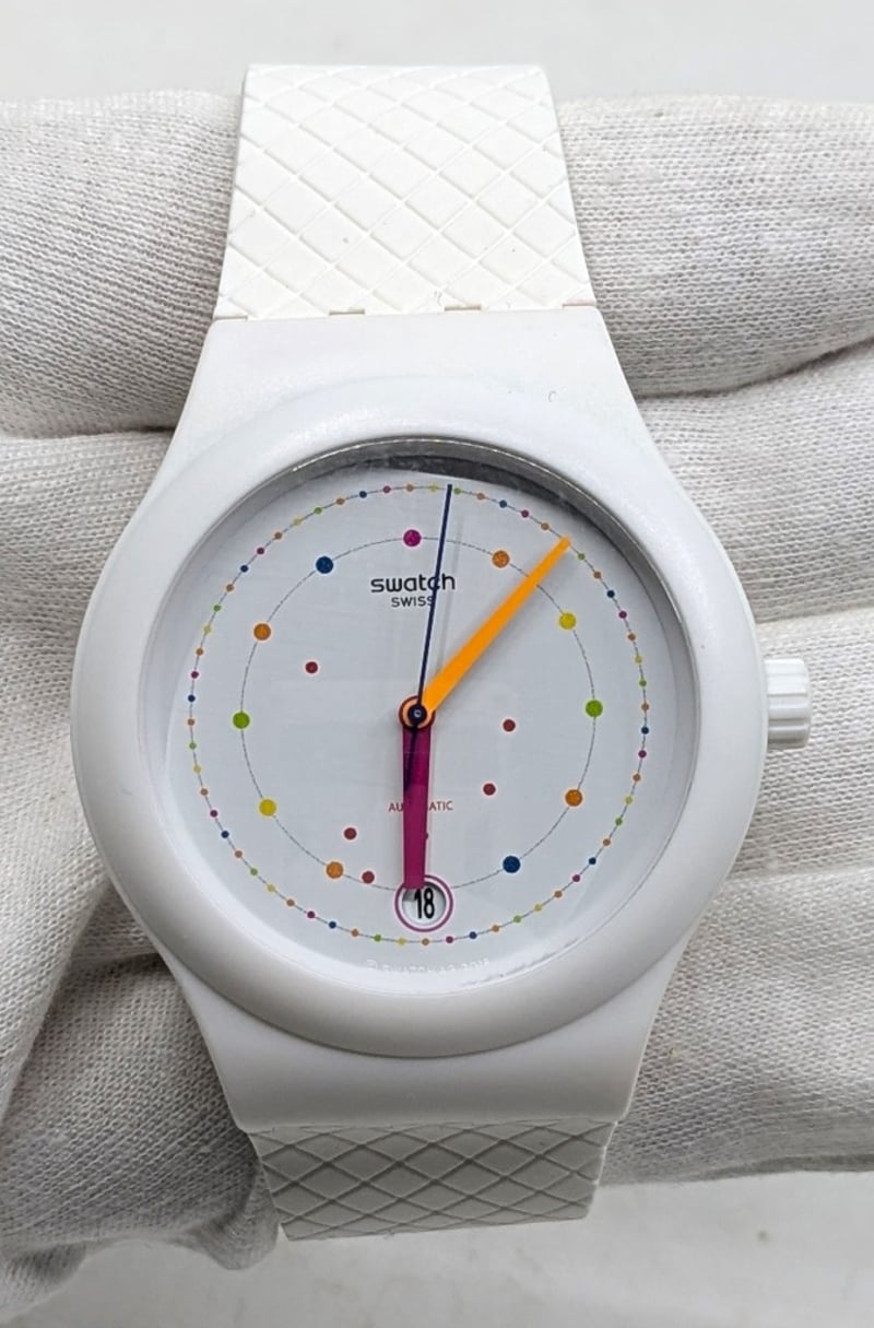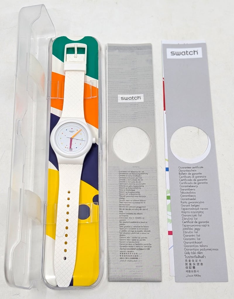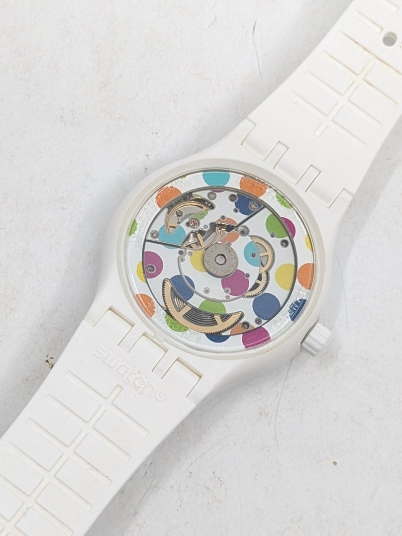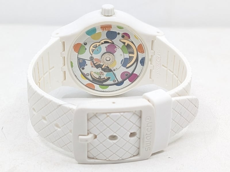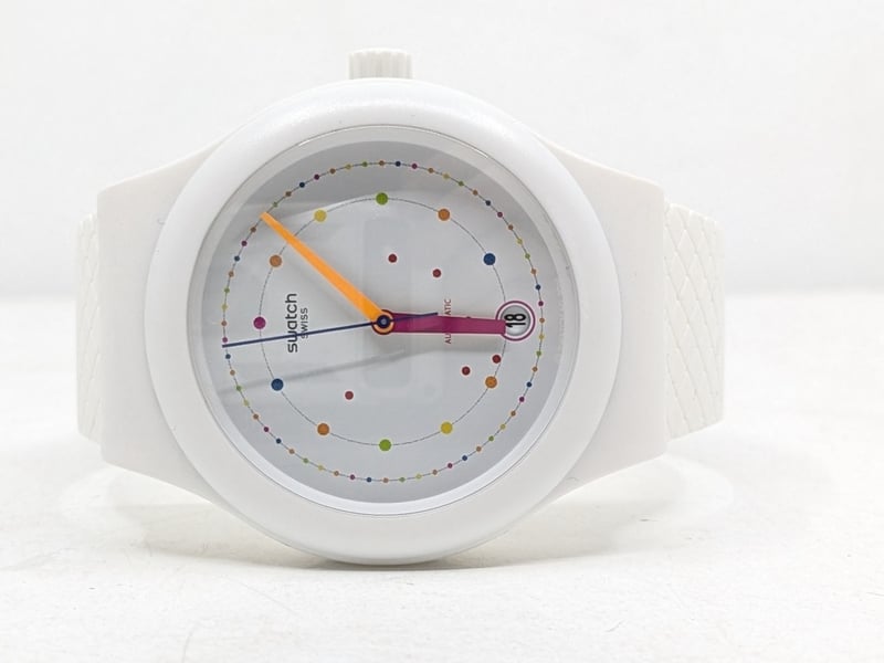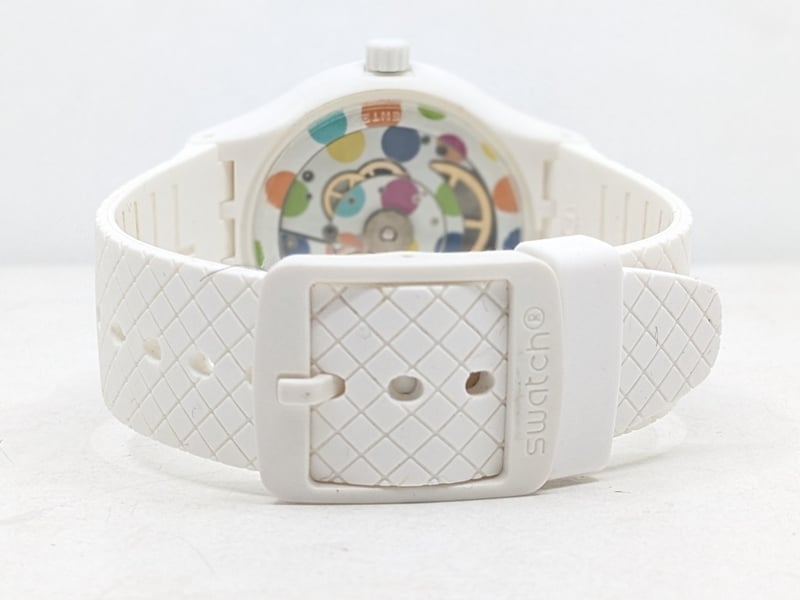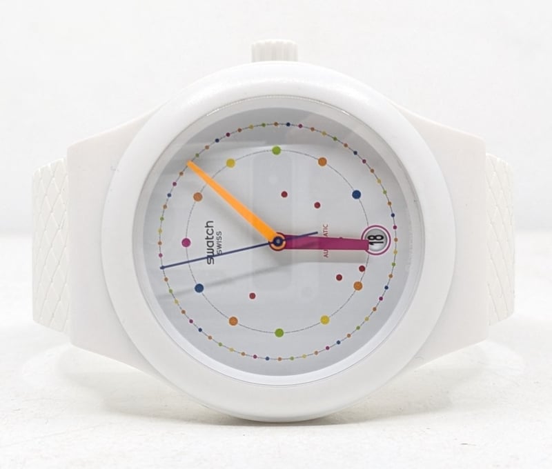 SWATCH SISTEM POLKA SUTW403 REFERENCE NO. SUTW403 CASE SIZE: 42MM BRACELET: MATTE WHITE SILICONE STRAP AFFIXED WITH A WHITE SILICONE LOOP AND MATTE WHITE POLYMER BUCKLE MOVEMENT: AUTOMATIC BOX: INCLUDED PAPERS: INCLUDED Condition: Good - Refer To Images FC 991650+3