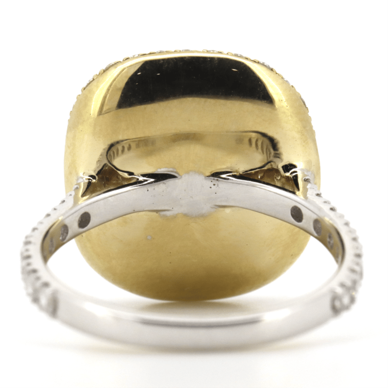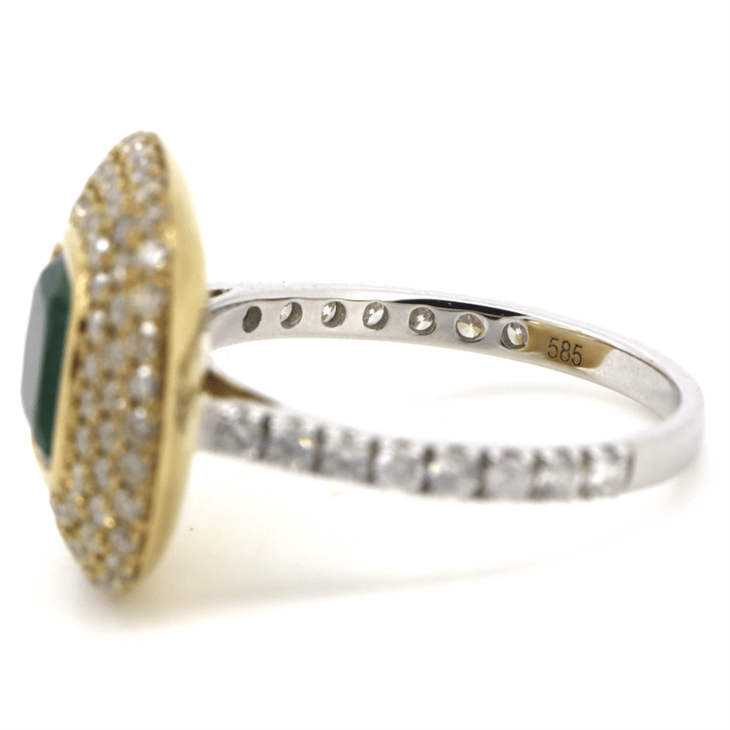 14K WHITE/YELLOW GOLD, EMERALD AND DIAMOND, HALO COCKTAIL RING. The Centre Design Features, One Cushion Cut, Dark Blue/Green, Emerald (1.65Ct, Slightly Included), Bezel Set In Yellow Gold. Encompassing The Design Are, 100 Round Brilliant Cut, Diamonds (1.08Ct Tdw, G-H Colour, Si1-Si2 Clarity), Micro-Claw Set In White/Yellow Gold. Ring Size M 1/2. Valuations Provided by an Independent Third-Party Professional Not Directly Associated With Lloyds Auctions at AUD $$27,000.00This valuation has been conducted by an independent third-party professional. The valuation amount is an assessment by the issuing valuer and does not reflect the auction value of the item. Any inquiries regarding the valuation should be directed to the issuing valuer (refer to contact details on the certificate), as Lloyds Auctions has no affiliation or influence over the valuation, the valuer, or the stated amount. Condition: Good - Refer Images 0645844+5094