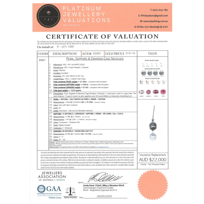 The Design Features, One Round, Grey With Silver Overtones, Cultured Tahitian Pearl (16.00Mm Size, Lustre Aa), Unset In A "Cage" Chain. The Chain Features, 15 Pear/Round Cut, Moderate Pink, Sapphires (0.81Ct Tsw, Slightly Included), And 28 Round Brilliant Cut, Diamonds (0.13Ct Tdw, G-H Colour, Si1-Si2 Clarity), Bezel/Bead Set. The Necklace Features A Lobster Claw Clasp Closure. Necklace Length Is 18Cm.