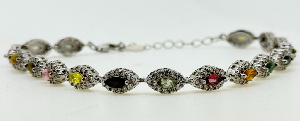 MULTI-COLOURED TOURMALINE MARQUISE CUT SILVER BRACELET Total Item Weight: 10.30g Length: 21.00cm Condition: Good - Refer To Images 488271+2