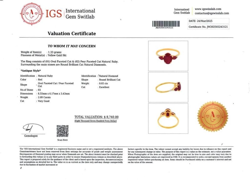 9CT YELLOW GOLD RUBY AND DIAMOND RING Ring Yellow Gold Natural Ruby : 2.09 Carat Natural Diamond : 0.02 Carat Item Weight : 1.33 G Valuations Provided by an Independent Third-Party Professional Not Directly Associated With Lloyds Auctions at AUD $8740This valuation has been conducted by an independent third-party professional. The valuation amount is an assessment by the issuing valuer and does not reflect the auction value of the item. Any inquiries regarding the valuation should be directed to the issuing valuer (refer to contact details on the certificate), as Lloyds Auctions has no affiliation or influence over the valuation, the valuer, or the stated amount. Condition: Good - Refer Images 0586170+243121