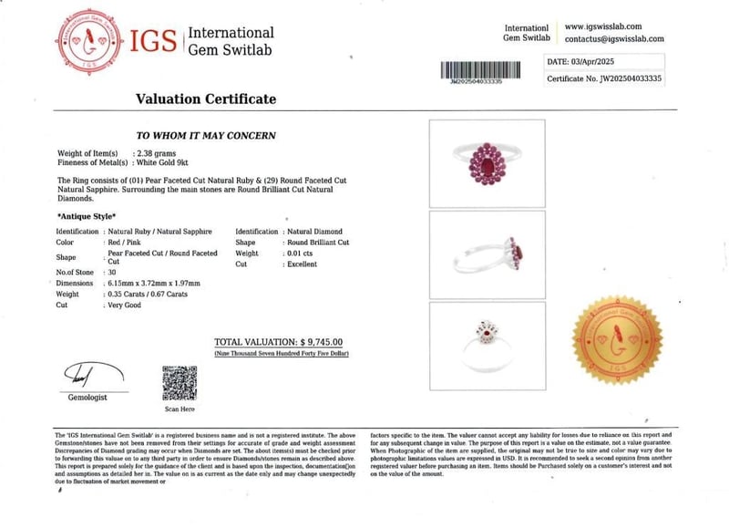 9CT WHITE GOLD RUBY, SAPPHIRE AND DIAMONG RING Ring White Gold 9K Natural Ruby : 0.35 Carat Natural Sapphire : 0.67 Carat Natural Diamond : 0.01 Carat Item Weight : 2.38 G Valuations Provided by an Independent Third-Party Professional Not Directly Associated With Lloyds Auctions at AUD $9745This valuation has been conducted by an independent third-party professional. The valuation amount is an assessment by the issuing valuer and does not reflect the auction value of the item. Any inquiries regarding the valuation should be directed to the issuing valuer (refer to contact details on the certificate), as Lloyds Auctions has no affiliation or influence over the valuation, the valuer, or the stated amount. Condition: Good - Refer Images 0586170+33335