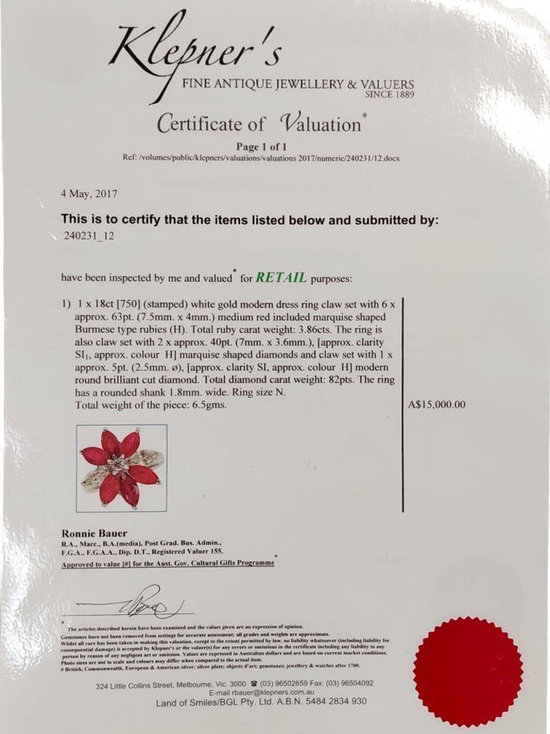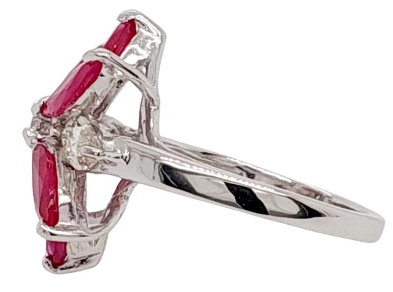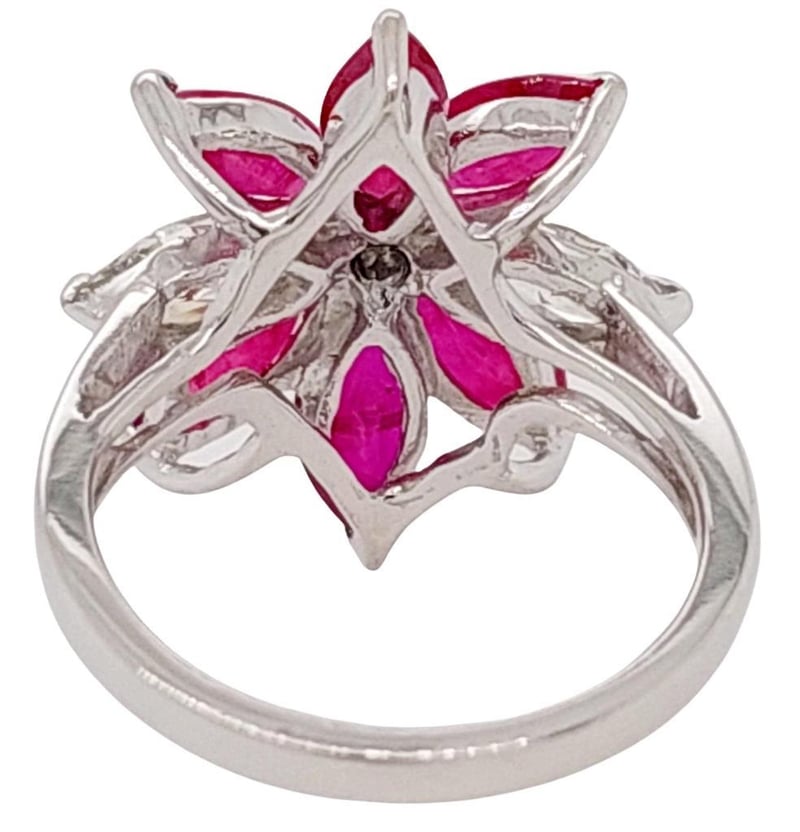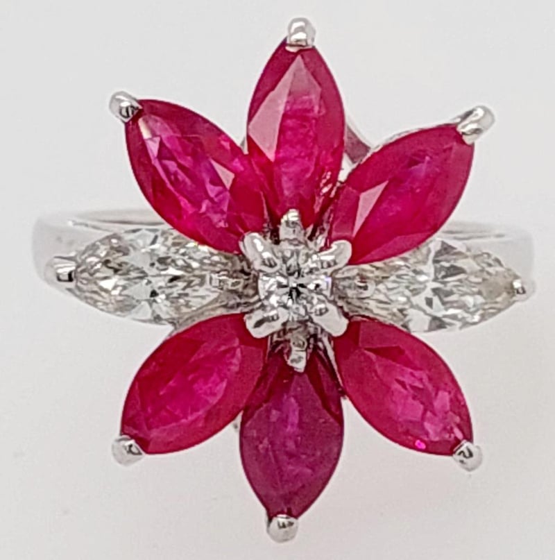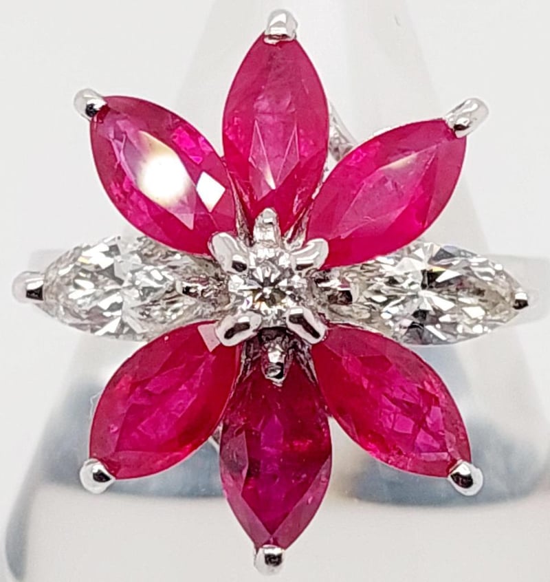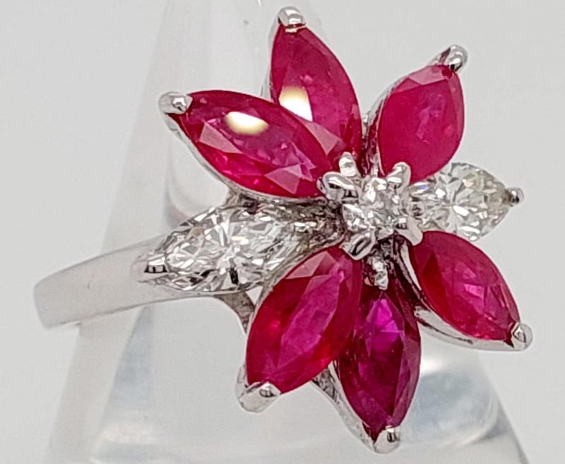 18CT WHITE GOLD RUBY AND DIAMOND SET DRESS RING Total Item Weight: 6.5gms This 18Ct White Gold Dress Ring With A Rounded Shank Features Six (6) X Claw Set Marquise Cut Burmese Type Rubies, Tcw: 3.86Ct, Measuring 7.5Mm X 4Mm, Medium Red In Colour And Included In Clarity. The Rings Also Features Two (2) X Claw Set Marquise Cut Diamonds Measuring 7Mm X 3Mm, Approx. Si In Clary And Approx. H In Colour With One (1) Claw Set Modern Round Brilliant Cut Diamond Measuring 2.5Mm X 2.5Mm, Approx. Si In Clarity And Approx. H In Colour. Total Diamond Carat Weight: 0.82.Australian Ring Size: N Markings: 750 Jewellery Valuations Provided By A Third Party Professional Not Directly Associated With Lloyds Auctions at AUD $15000This Insurance Valuation has been provided by a registered Jewellery Valuer and is intended for insurance purposes only. The valuation amount has no bearing on the auction value of the item. Any questions regarding the valuation should be directed to the issuing Valuer (refer to contact details on the certificate) as Lloyds have no association or relationship with the Valuer or the valuation amount contained within the valuation. Condition: Excellent- Refer Images 0162901+18CROSSDOCK