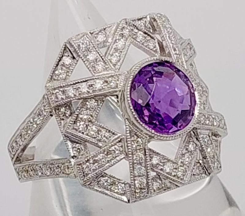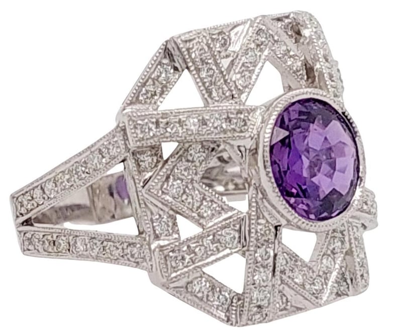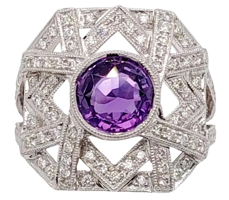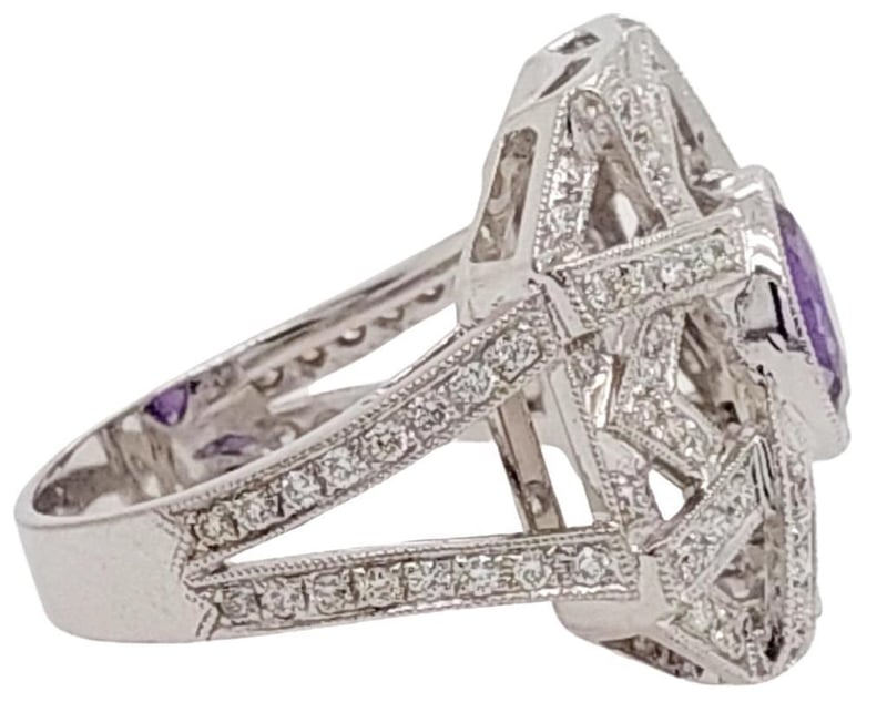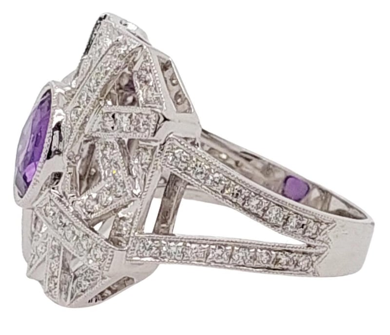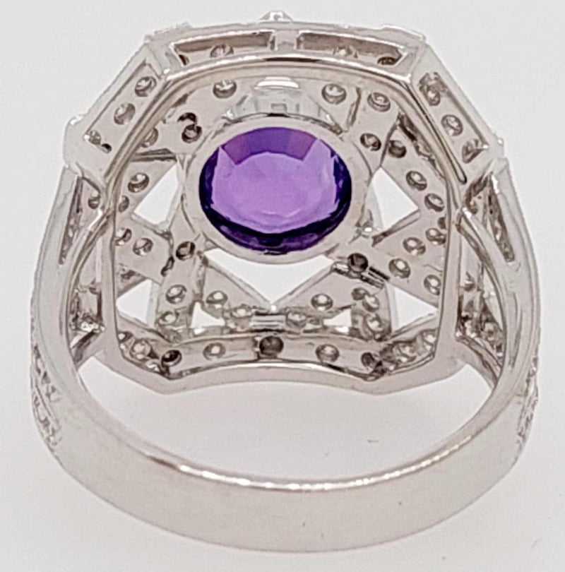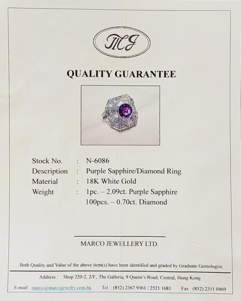 18CT WHITE GOLD PURPLE SAPPHIRE AND DIAMOND SET RING This 18Ct White Gold Ring Features One (1) X Bezel Set Round Brilliant Cut 2.09Ct Purple Sapphire With One Hundred (100) X Claw Set Round Brilliant Cut Diamonds With A Total Combined Weight Of 0.70Ct.Australian Ring Size: N Condition: Excellent- Refer Images 0162901+23CROSSDOCK