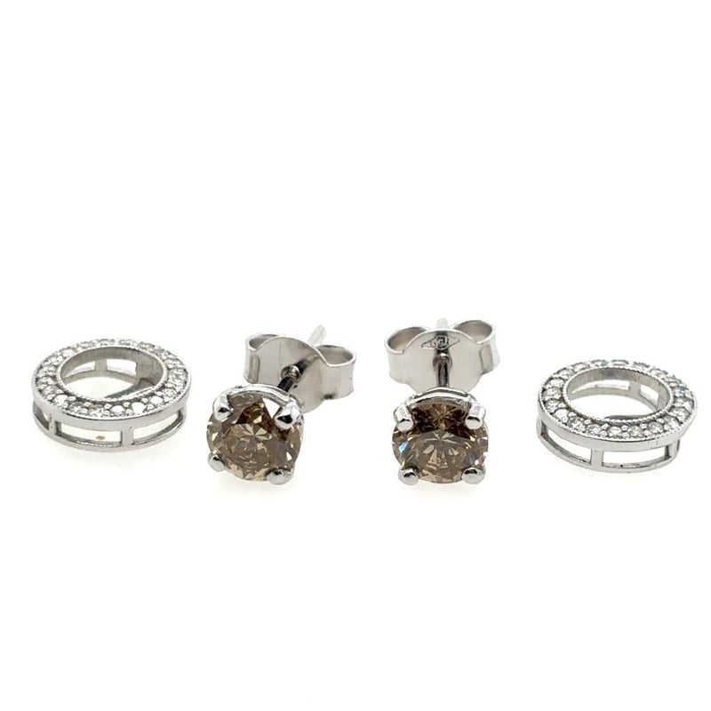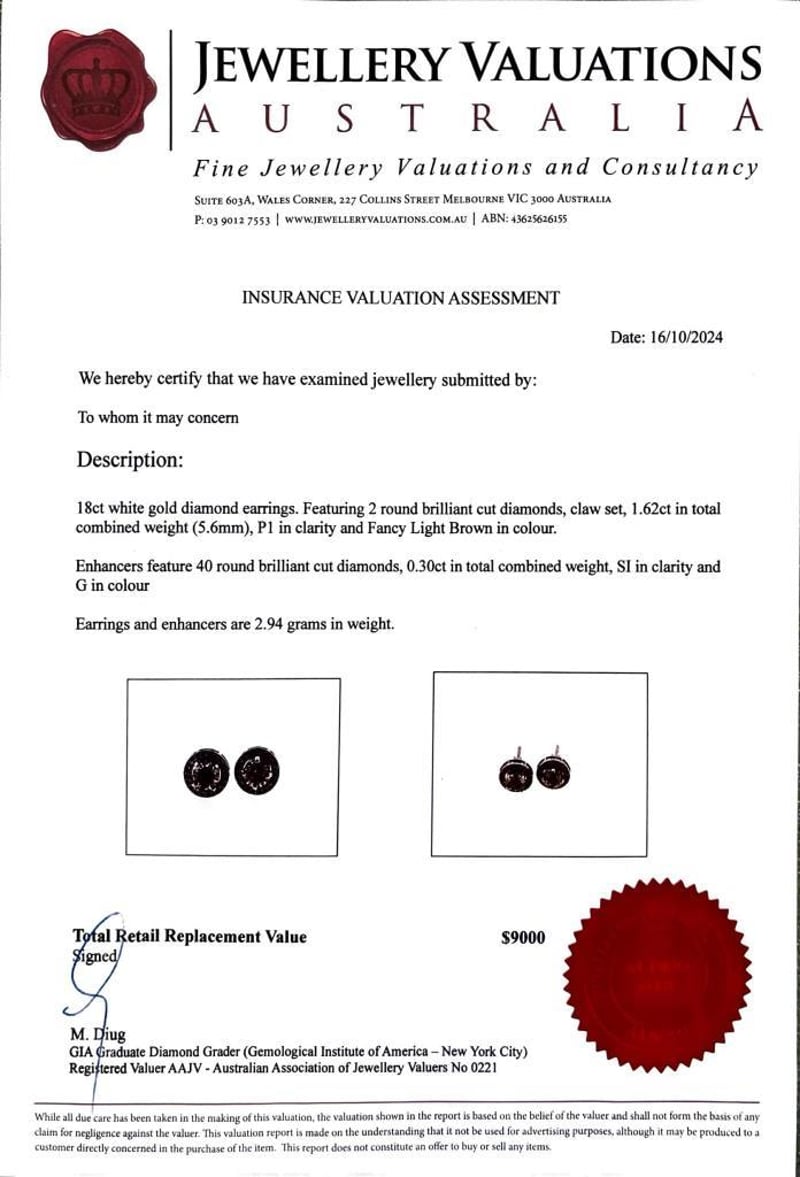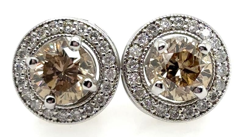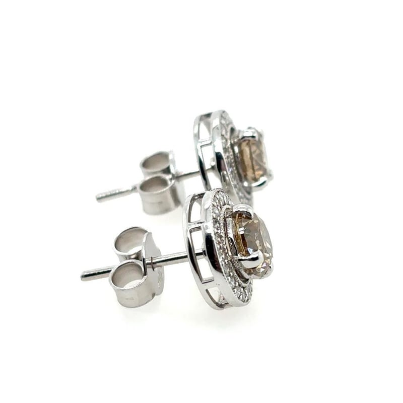 These 18Ct White Gold Earrings Feature 2 X Round Brilliant Cut Claw Set Diamonds, Measuring 5.6Mm, Tcw: 1.62, Clarity: P1, Colour: Fancy Light Brown. The Enhancers Feature 40 X Round Brilliant Cut Diamonds, Tcw: 0.30, Clarity: Si, Colour: G.