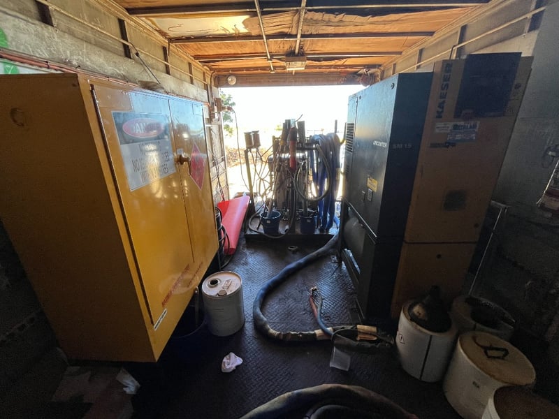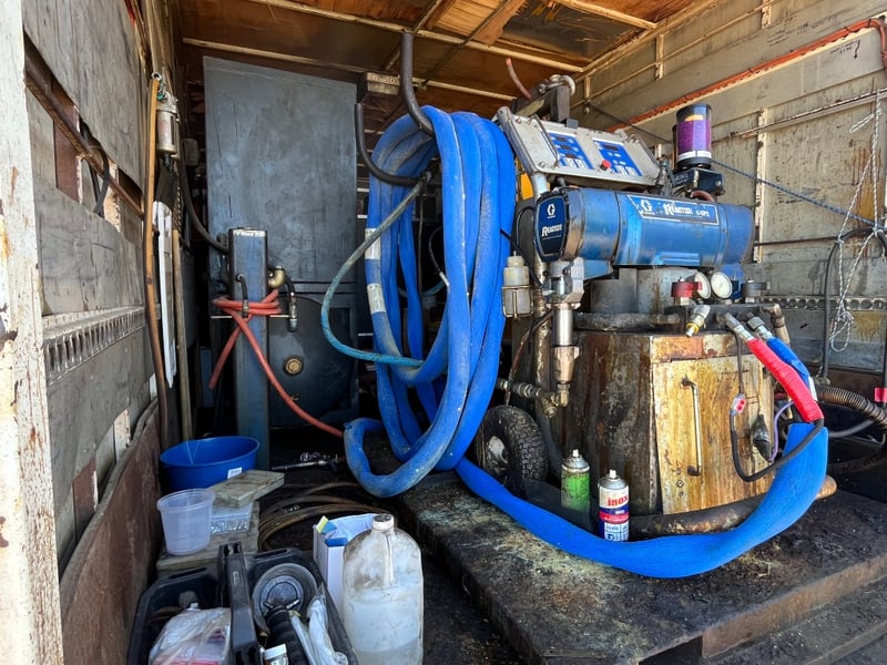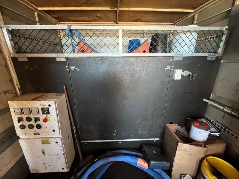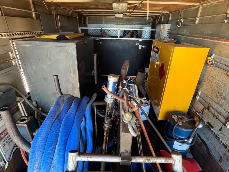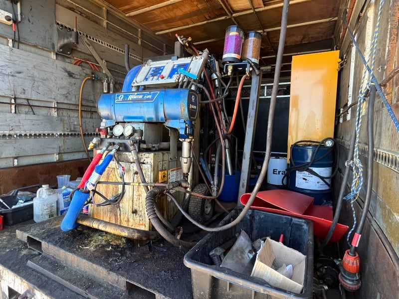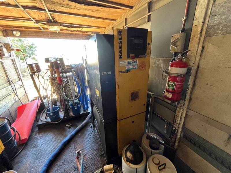 Description: Fitted with Kaeser-SM15 Electric Compressor (55cfm @ 125psi), Duetz 4cyl Diesel- with Stamford 3 Phase Generator & Graco Reactor E-XP2 Poly Pump (with new lines), Pallet of cleaning products in 44gal & 20ltr drums.