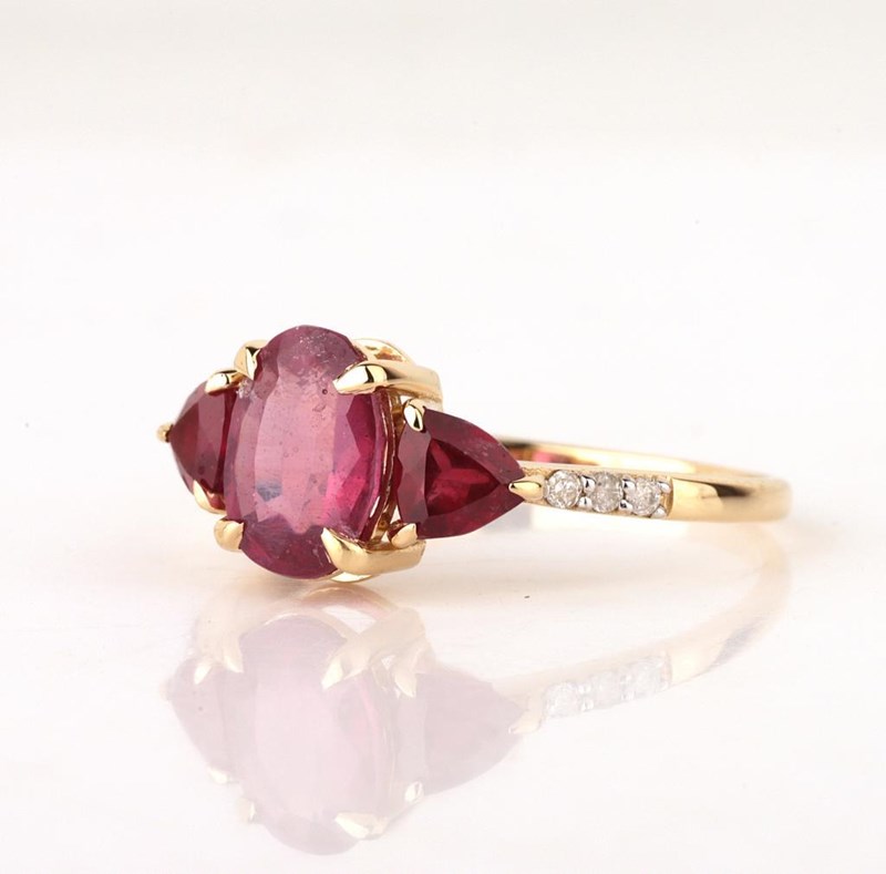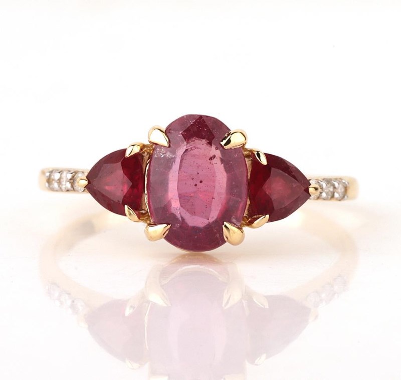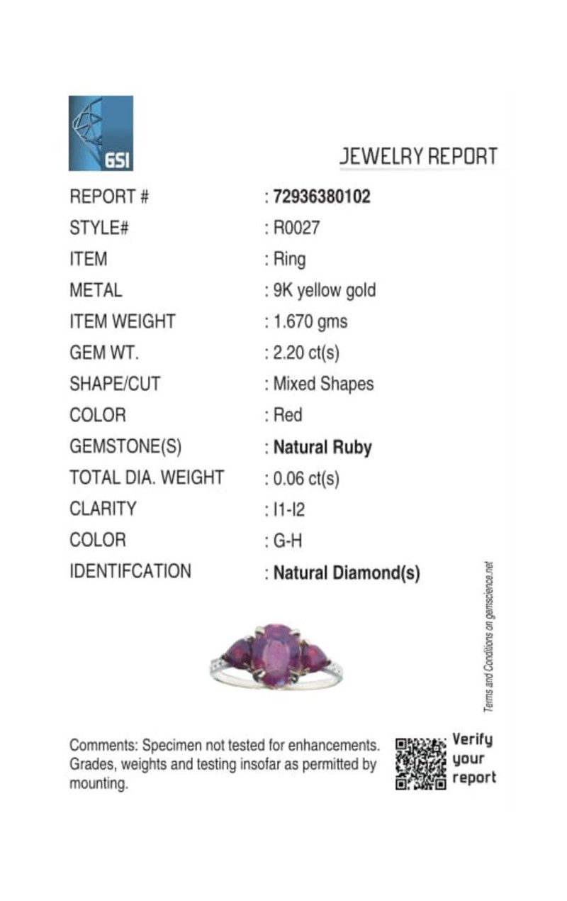 9CT YELLOW GOLD NATURAL RUBY & DIAMOND RING Weight Of The Item: 1.67 GFineness Of Metal(S): Yellow Gold 9KtThe Ring Consists Of (1) Oval Brilliant Natural Ruby & (2) Round Brilliant Cut Ruby. Surrounding The Main Stones Are Round Brilliant Cut Natural Diamonds.Ring Size: Us 7Identification: Natural Ruby / Natural RubyColor: Red / RedShape: Oval Brilliant Cut / Trillion Faceted CutNo. Of Stone: 3Dimension: 8 Mm X 6 Mm X 4.8 MmWeight: 1.6 Carats / 0.6 CaratsCut: Very GoodIdentification: Natural DiamondShape: Round Brilliant CutWeight: 0.06 CtsCertificates Are Provided By Gemological Science International (Gsi), An Independent Third-Party Gemological Laboratory Based In The Usa And Recognised Among The Top 10 Gem Labs Globally Condition: Good - Refer Images 0160841+142