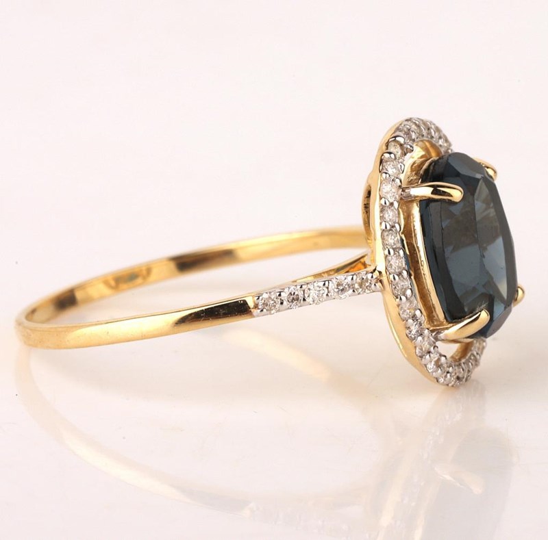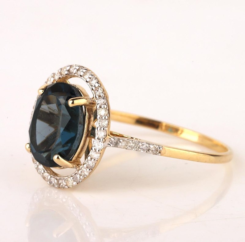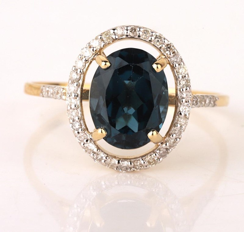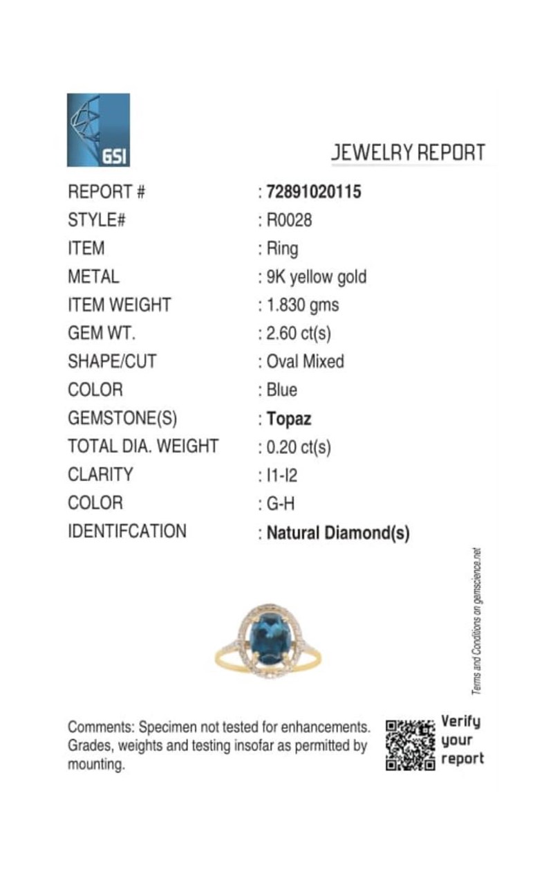 9CT YELLOW GOLD NATURAL LONDON BLUE TOPAZ & DIAMOND RING Weight Of The Item: 1.83 GFineness Of Metal(S): Yellow Gold 9KtThe Ring Consists Of (1) Oval Brilliant Natural London Blue Topaz. Surrounding The Main Stones Are Round Brilliant Cut Natural Diamonds.Ring Size: Us 7Identification: Natural London Blue TopazColor: BlueShape: Oval Brilliant CutNo. Of Stone: 1Dimension: 9 Mm X 7 Mm X 5.4 MmWeight: 2.6 CaratsCut: Very GoodIdentification: Natural DiamondShape: Round Brilliant CutWeight: 0.2 CtsCertificates Are Provided By Gemological Science International (Gsi), An Independent Third-Party Gemological Laboratory Based In The Usa And Recognised Among The Top 10 Gem Labs Globally Condition: Good - Refer Images 0160841+150