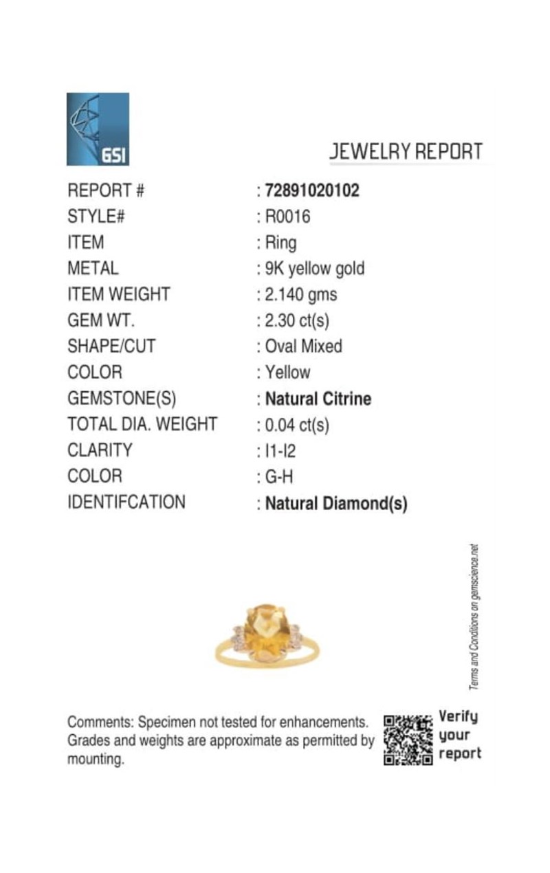 9CT YELLOW GOLD NATURAL CITRINE & DIAMOND RING Weight Of The Item: 2.14 GFineness Of Metal(S): Yellow Gold 9KtThe Ring Consists Of (1) Oval Brilliant Natural Citrine. Surrounding The Main Stones Are Round Brilliant Cut Natural Diamonds.Ring Size: Us 7Identification: Natural CitrineColor: YellowShape: Oval Brilliant CutNo. Of Stone: 1Dimension: 10 Mm X 8 Mm X 6 MmWeight: 2.3 CaratsCut: Very GoodIdentification: Natural DiamondShape: Round Brilliant CutWeight: 0.04 CtsCertificates Are Provided By Gemological Science International (Gsi), An Independent Third-Party Gemological Laboratory Based In The Usa And Recognised Among The Top 10 Gem Labs Globally Condition: Good - Refer Images 0160841+76