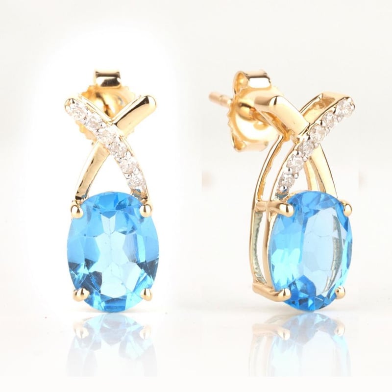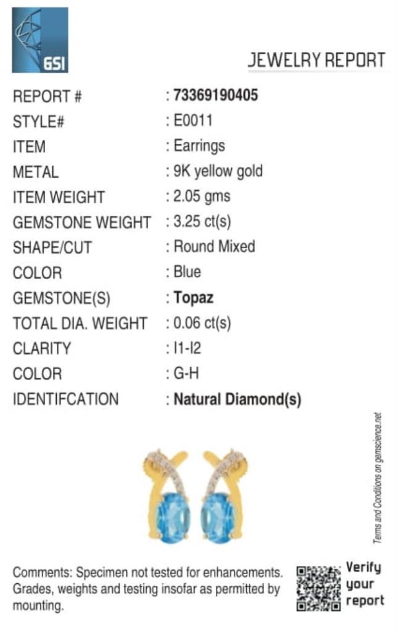 9CT YELLOW GOLD NATURAL SWISS BLUE TOPAZ & DIAMOND EARRINGS Weight Of The Item: 2.05 GFineness Of Metal(S): Yellow Gold 9KtThe Earrings Consists Of (2) Oval Brilliant Natural Swiss Blue Topaz. Surrounding The Main Stones Are Round Brilliant Cut Natural Diamonds.Antique StyleIdentification: Natural Swiss Blue TopazColor: BlueShape: Oval Brilliant CutNo. Of Stone: 2Dimension: 8 Mm X 6 Mm X 4.8 MmWeight: 3.25 CaratsCut: Very GoodIdentification: Natural DiamondShape: Round Brilliant CutWeight: 0.06 CtsCut: Excellent. Certificates Are Provided By Gemological Science International (Gsi), An Independent Third-Party Gemological Laboratory Based In The Usa And Recognised Among The Top 10 Gem Labs Globally Condition: Good - Refer Images 0488266+26