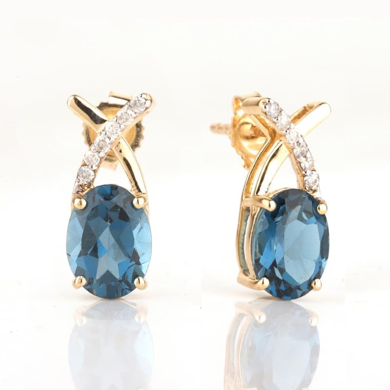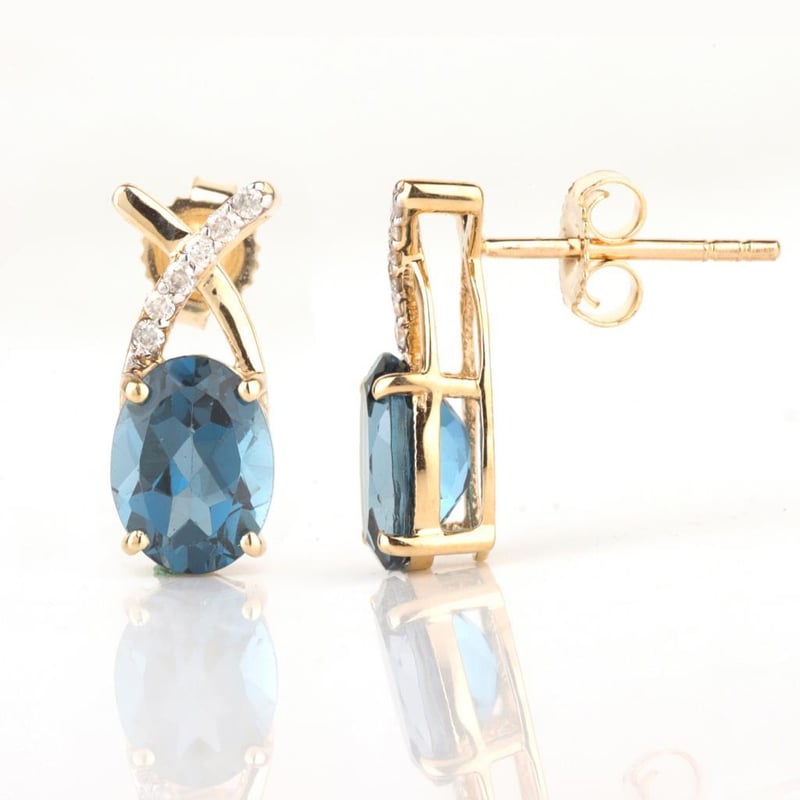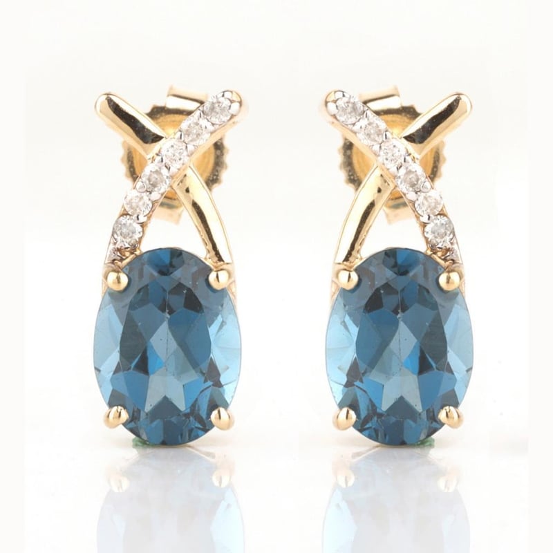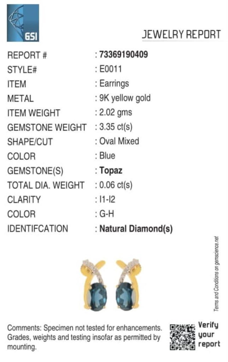 9CT YELLOW GOLD NATURAL LONDON BLUE TOPAZ & DIAMOND EARRINGS Weight Of The Item: 2.02 GFineness Of Metal(S): Yellow Gold 9KtThe Earrings Consists Of (2) Oval Brilliant Natural London Blue Topaz. Surrounding The Main Stones Are Round Brilliant Cut Natural Diamonds.Antique StyleIdentification: Natural London Blue TopazColor: BlueShape: Oval Brilliant CutNo. Of Stone: 2Dimension: 8 Mm X 6 Mm X 4.8 MmWeight: 3.35 CaratsCut: Very GoodIdentification: Natural DiamondShape: Round Brilliant CutWeight: 0.06 CtsCut: Excellent. Certificates Are Provided By Gemological Science International (Gsi), An Independent Third-Party Gemological Laboratory Based In The Usa And Recognised Among The Top 10 Gem Labs Globally Condition: Good - Refer Images 0488266+28