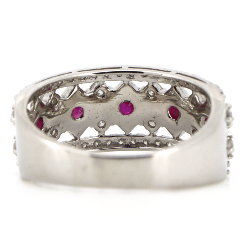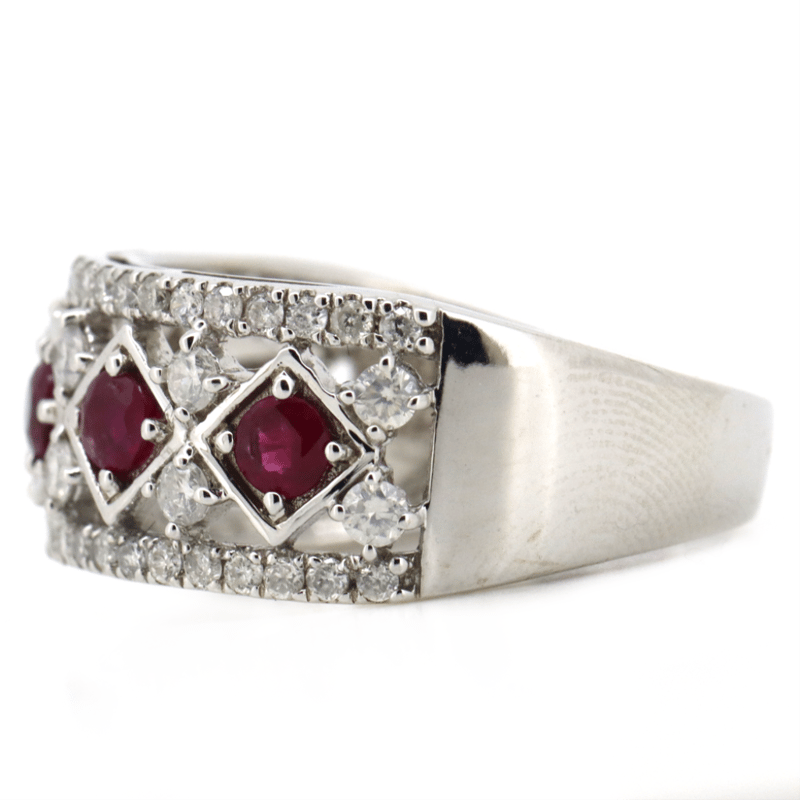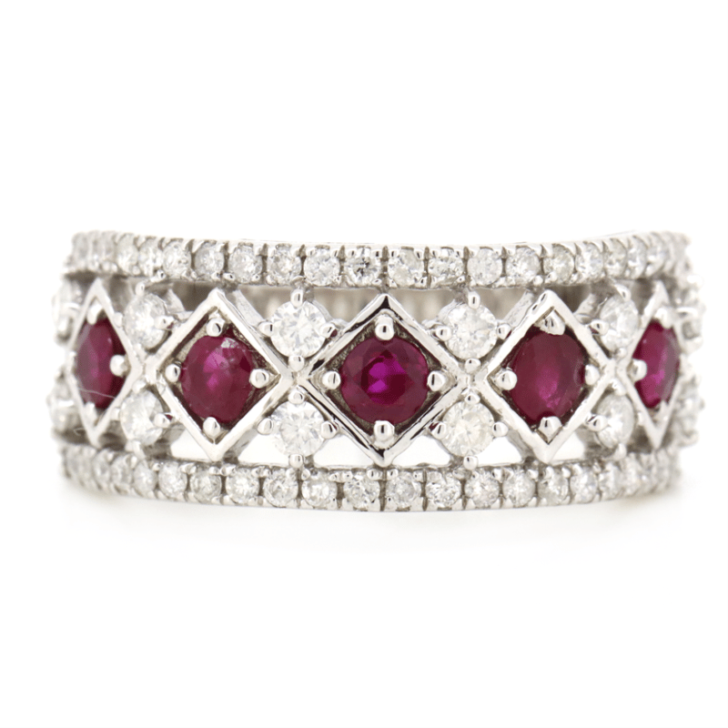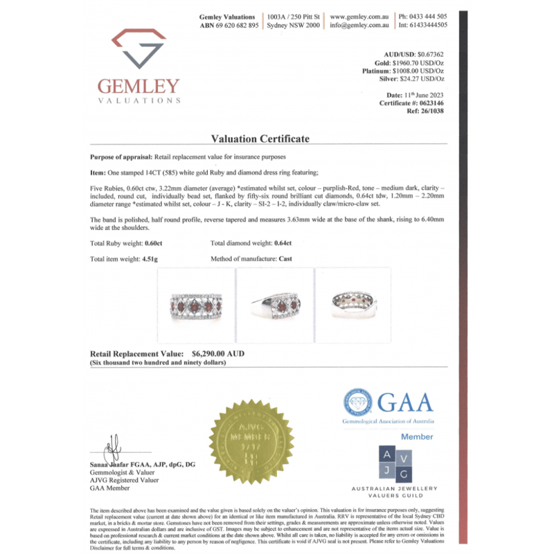 14K WHITE GOLD, RUBY AND DIAMOND, MULTI-ROW STATEMENT RING. THE DESIGN FEATURES, 5 ROUND CUT, PURPLISH-RED, RUBIES (0.60CT TSW, INCLUDED), BEAD SET. BORDERING THE DESIGN ARE, 56 ROUND BRILLIANT CUT, DIAMONDS (0.64CT TDW, J-K COLOUR, SI2-I2 CLARITY), CLAW/MICRO-CLAW SET. RING SIZE N. Valuations Provided by an Independent Third-Party Professional Not Directly Associated With Lloyds Auctions at AUD $$6,290.00This valuation has been conducted by an independent third-party professional. The valuation amount is an assessment by the issuing valuer and does not reflect the auction value of the item. Any inquiries regarding the valuation should be directed to the issuing valuer (refer to contact details on the certificate), as Lloyds Auctions has no affiliation or influence over the valuation, the valuer, or the stated amount. Condition: Good - Refer Images 0645858+1700