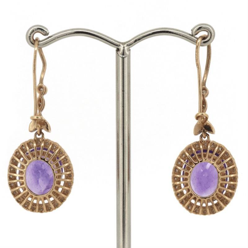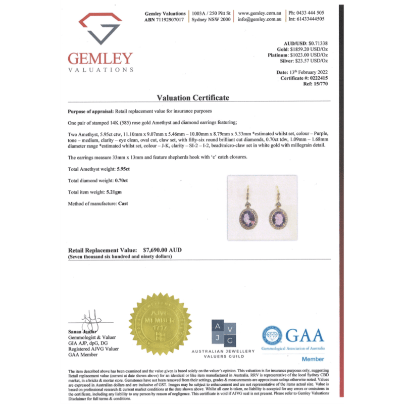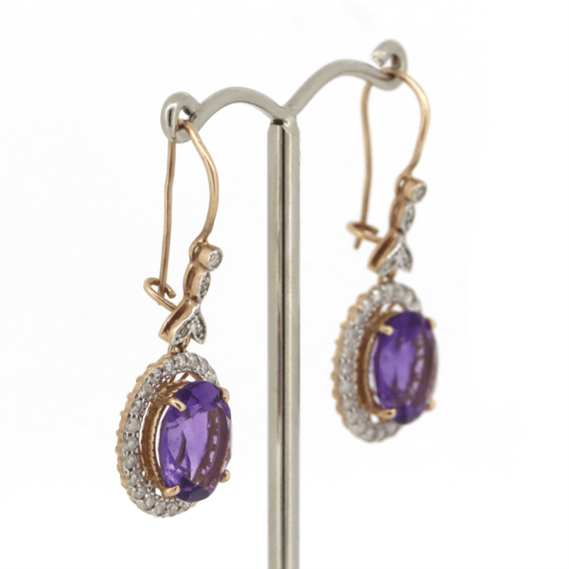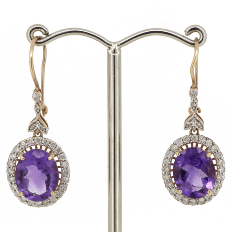 14K ROSE GOLD, AMETHYST AND DIAMOND, HALO DROP EARRINGS. THE CENTRES FEATURE, 2 OVAL CUT, MEDIUM PURPLE, AMETHYST (5.95CT TSW, EYE CLEAN CLARITY), 4 CLAW SET. SURROUNDING THE CENTRES IN A HALOS AND DECORATING THE DROPS ARE, 56 ROUND BRILLIANT CUT, DIAMONDS (0.70CT TDW, J-K COLOUR, SI2-I2 CLARITY), CLAW SET. THE EARRINGS HAVE SHEPHERD HOOKS WITH 'C' HOOK CLOSURES. Valuations Provided by an Independent Third-Party Professional Not Directly Associated With Lloyds Auctions at AUD $$7,690.00This valuation has been conducted by an independent third-party professional. The valuation amount is an assessment by the issuing valuer and does not reflect the auction value of the item. Any inquiries regarding the valuation should be directed to the issuing valuer (refer to contact details on the certificate), as Lloyds Auctions has no affiliation or influence over the valuation, the valuer, or the stated amount. Condition: Good - Refer Images 0645858+1674
