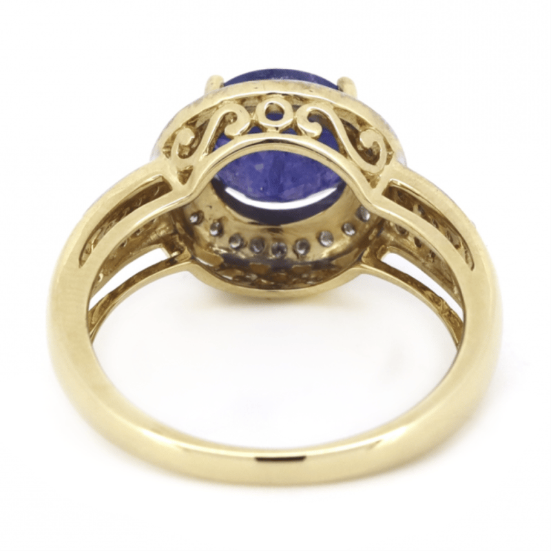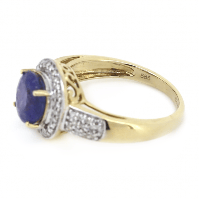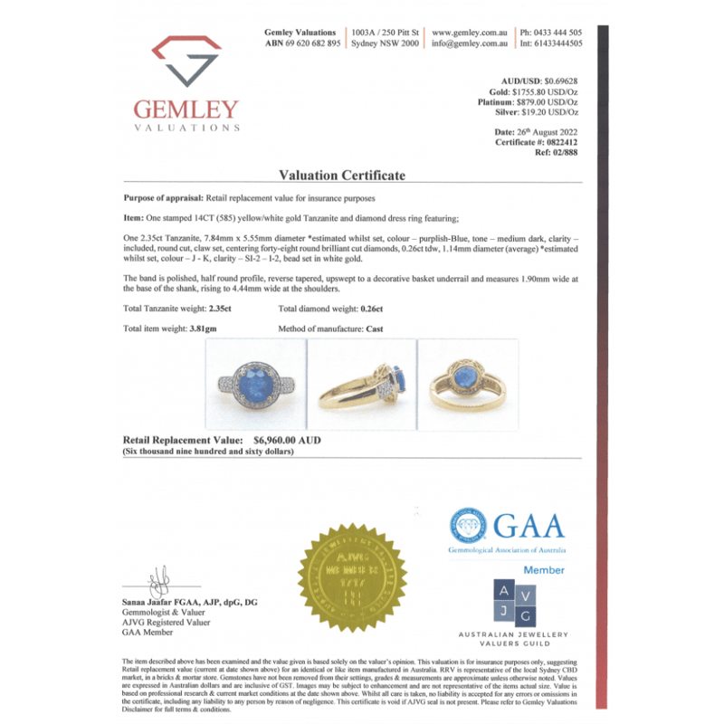 14K YELLOW GOLD, TANZANITE AND DIAMOND, CLUSTER RING. THE CENTRE FEATURES, ONE ROUND CUT, MEDIUM DARK PURPLISH-BLUE, TANZANITE (2.35CT, INCLUDED), CLAW SET. SURROUNDING THE CENTRE IN A HALO AND DECORATING THE SHOULDERS ARE, 48 ROUND BRILLIANT CUT, DIAMONDS (0.26CT TDW, J-K COLOUR, SI2-I2 CLARITY), BEAD SET IN WHITE GOLD. RING SIZE N. THE TANZANITE HAS SOME SMALL NATURAL INCLUSIONS THAT HAVE REACHED THE SURFACE. Valuations Provided by an Independent Third-Party Professional Not Directly Associated With Lloyds Auctions at AUD $$6,960.00This valuation has been conducted by an independent third-party professional. The valuation amount is an assessment by the issuing valuer and does not reflect the auction value of the item. Any inquiries regarding the valuation should be directed to the issuing valuer (refer to contact details on the certificate), as Lloyds Auctions has no affiliation or influence over the valuation, the valuer, or the stated amount. Condition: Good - Refer Images 0645858+1654