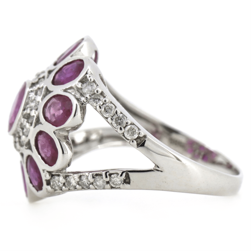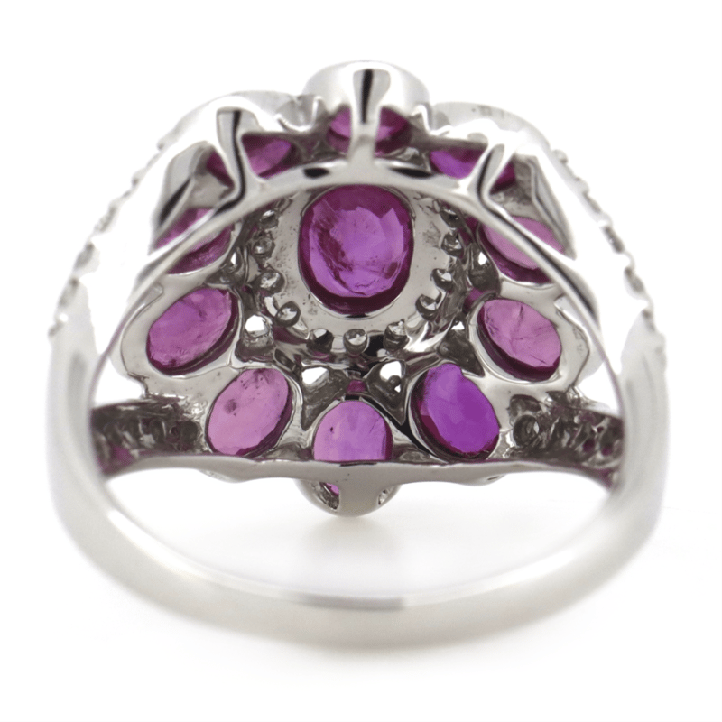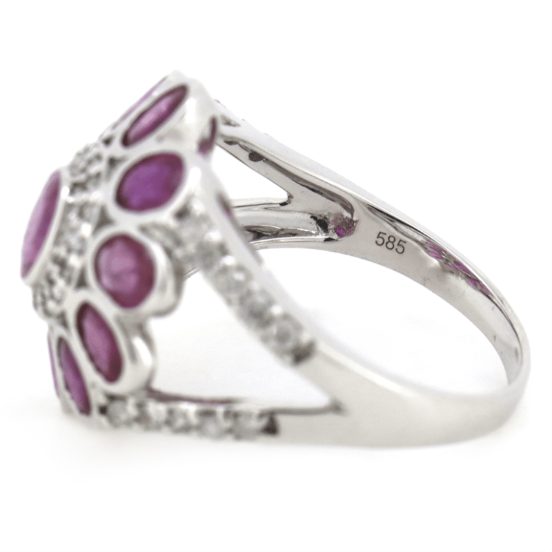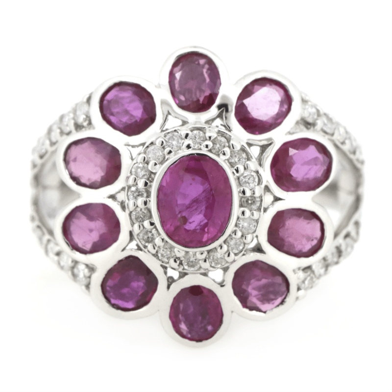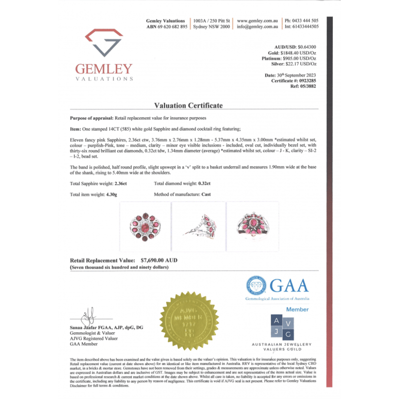 14K WHITE GOLD, PINK SAPPHIRE AND DIAMOND, ART DECO INSPIRED RING. THE CENTRE FEATURES, 11 OVAL CUT, MEDIUM REDDISH-PINK, SAPPHIRES (2.36CT TSW, MINOR EYE VISIBLE INCLUSIONS), BEZEL SET. DECORATING THE CENTRE ARE, 36 ROUND BRILLIANT CUT, DIAMONDS (0.34CT TDW, J-K COLOUR, SI2-I2 CLARITY), BEAD SET. RING SIZE L 1/2. Valuations Provided by an Independent Third-Party Professional Not Directly Associated With Lloyds Auctions at AUD $$7,690.00This valuation has been conducted by an independent third-party professional. The valuation amount is an assessment by the issuing valuer and does not reflect the auction value of the item. Any inquiries regarding the valuation should be directed to the issuing valuer (refer to contact details on the certificate), as Lloyds Auctions has no affiliation or influence over the valuation, the valuer, or the stated amount. Condition: Good - Refer Images 0645858+1692