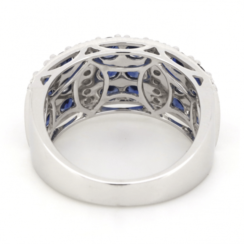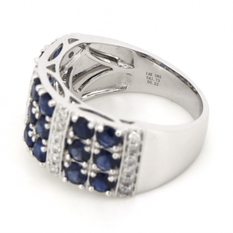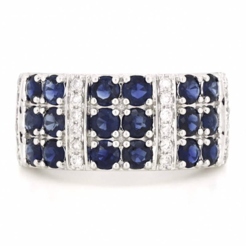 14K WHITE GOLD, BLUE SAPPHIRE AND DIAMOND, DECORATIVE BAND RING. THE DESIGN FEATURES, 18 ROUND CUT, ROYAL BLUE, SAPPHIRES (1.73CT TSW, EYE CLEAN CLARITY), 4 CLAW SET. ALTERNATING IN ROWS BETWEEN ARE, 24 ROUND BRILLIANT CUT, DIAMONDS (0.23CT TDW, G-H COLOUR, SI2-I2 CLARITY), MICRO-CLAW SET. RING SIZE M. Valuations Provided by an Independent Third-Party Professional Not Directly Associated With Lloyds Auctions at AUD $$4,940.00This valuation has been conducted by an independent third-party professional. The valuation amount is an assessment by the issuing valuer and does not reflect the auction value of the item. Any inquiries regarding the valuation should be directed to the issuing valuer (refer to contact details on the certificate), as Lloyds Auctions has no affiliation or influence over the valuation, the valuer, or the stated amount. Condition: Good - Refer Images 0645858+1655